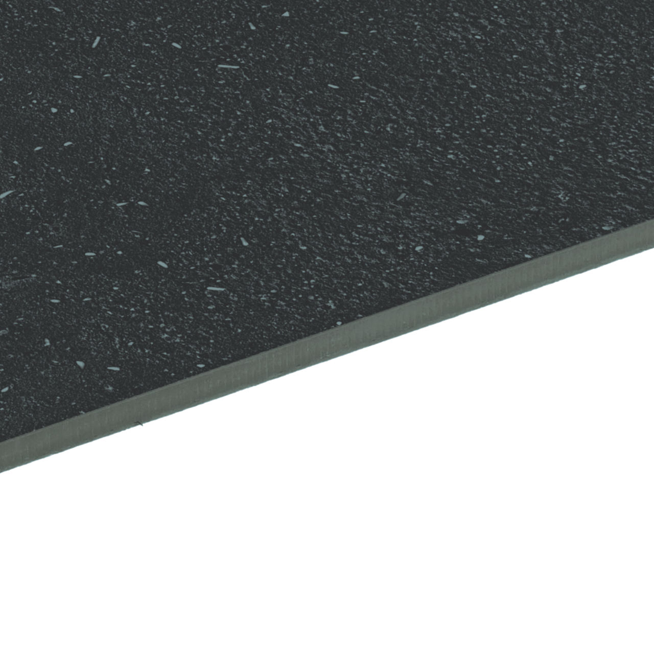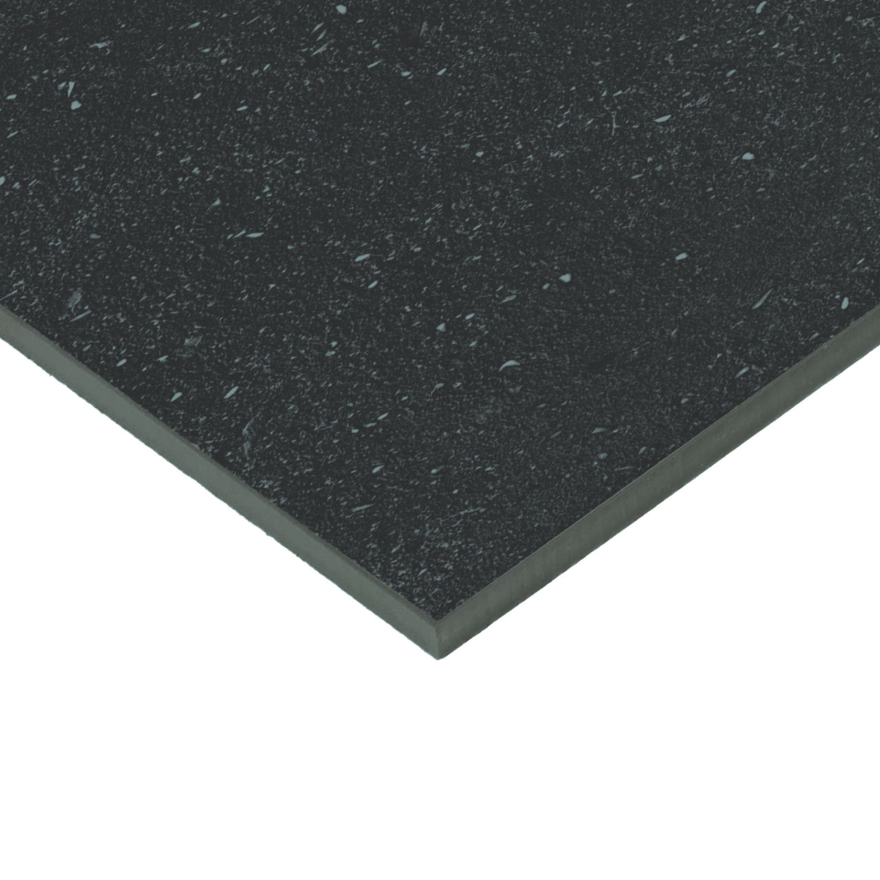 This dark terrazzo-look tile features a Palazzo pattern with durable performance for versatile spaces.