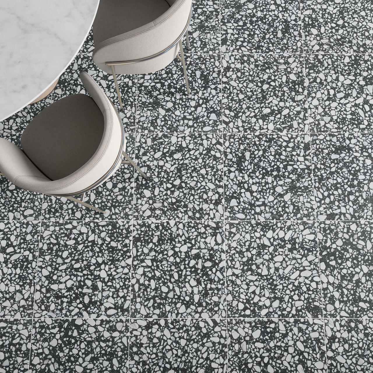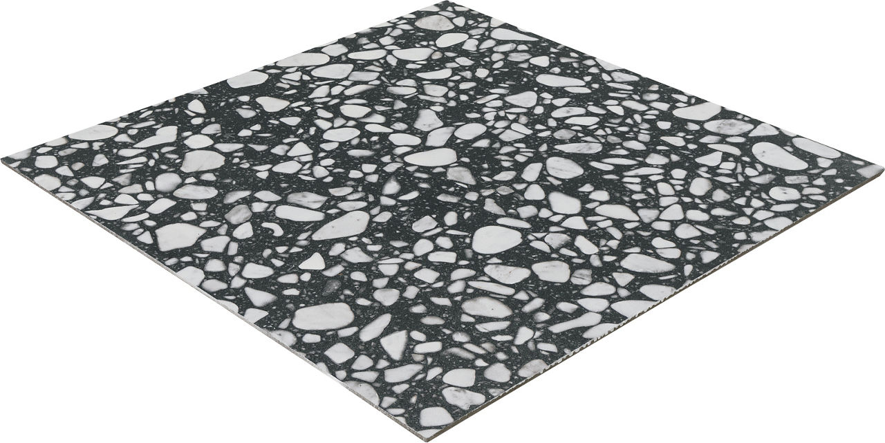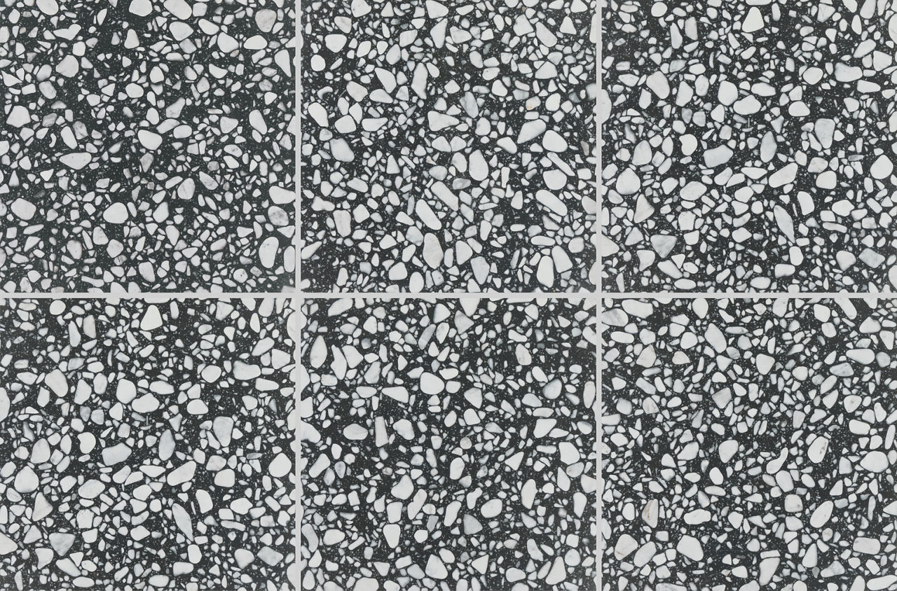 Dark terrazzo-look porcelain tile in Onyx. A 24X24 matte tile with Grande pattern for modern design.