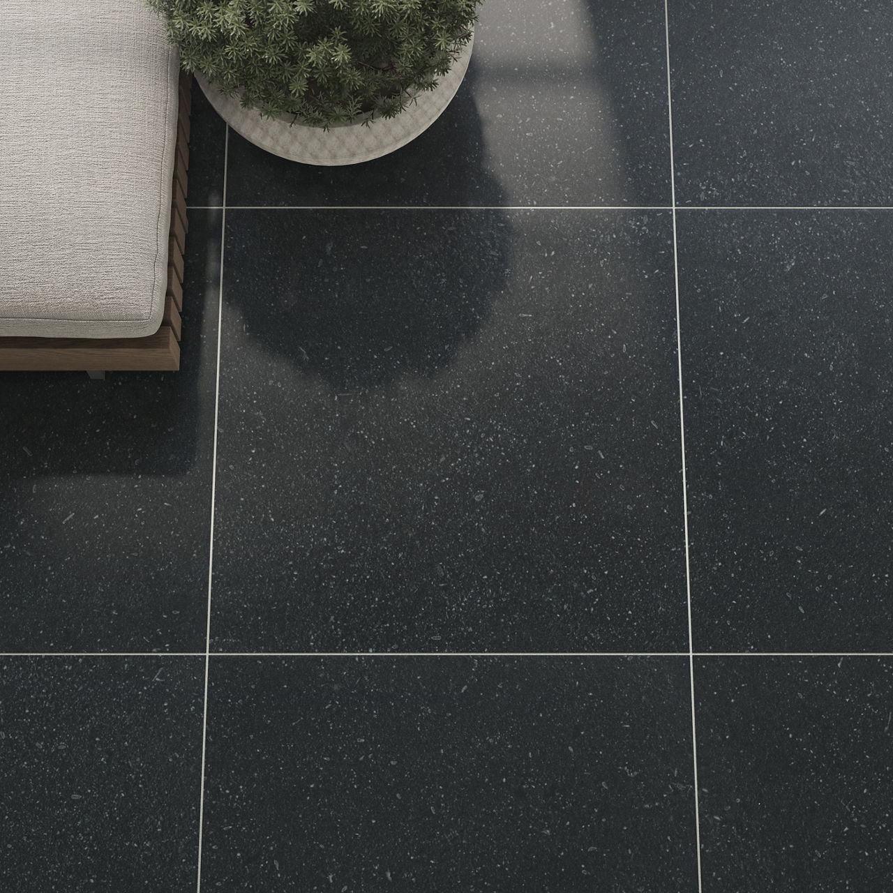 Dark terrazzo-look porcelain tile in Onyx. A 24X24 matte tile with Palazzo pattern for modern design.