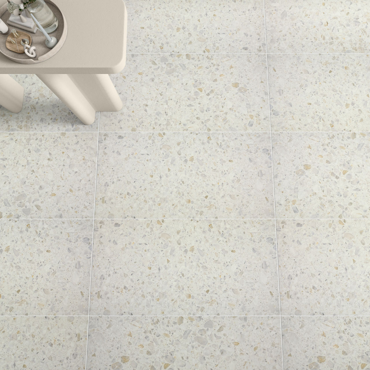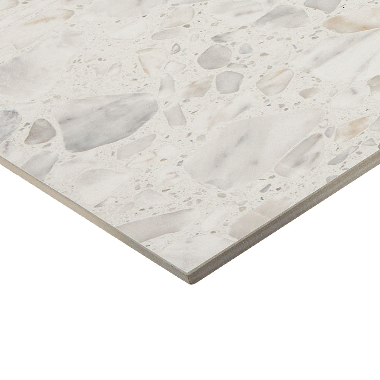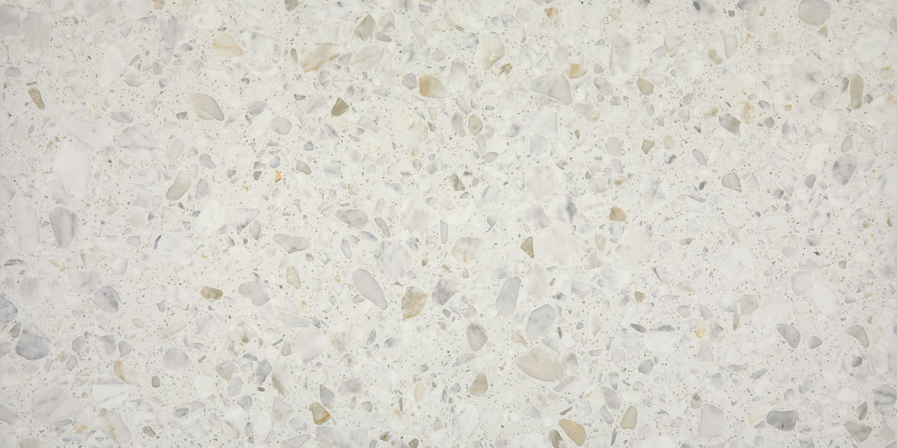 This mid-tone terrazzo-look tile features a Grande pattern with durable performance for versatile spaces.