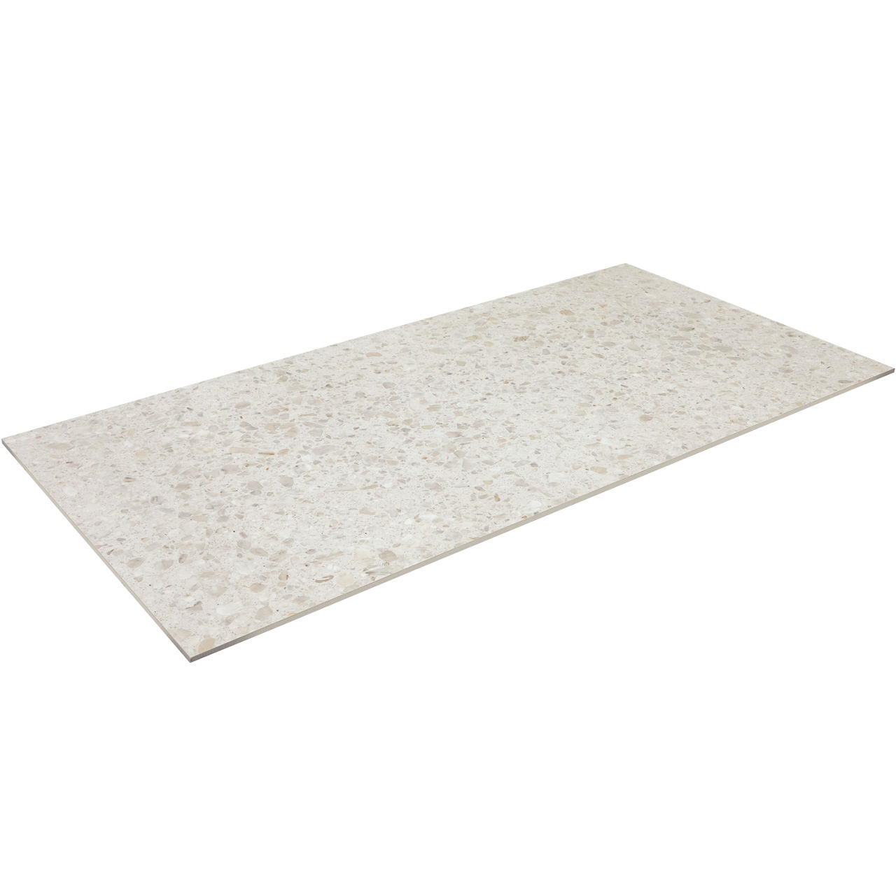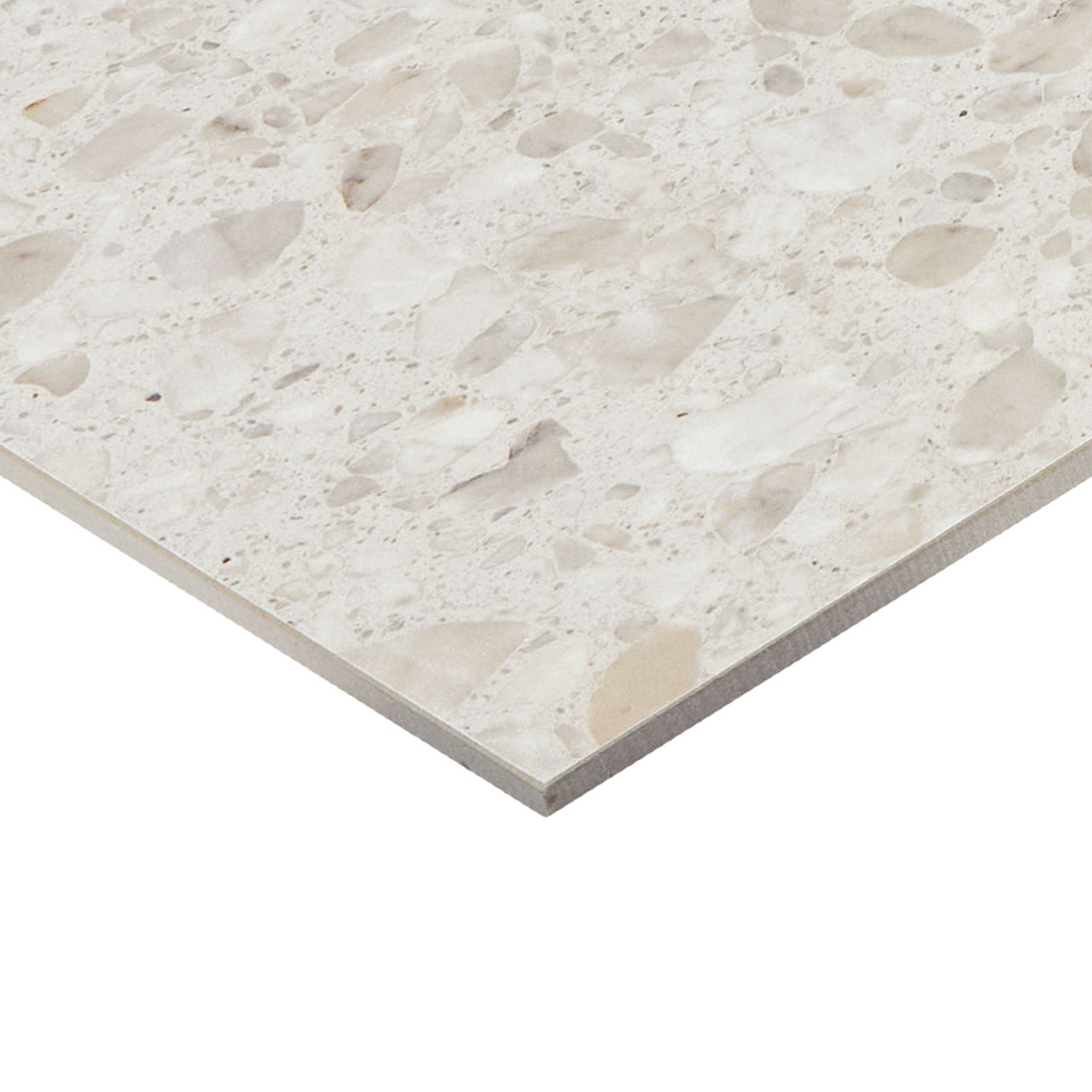This mid-tone terrazzo-look tile features a Medio pattern with durable performance for versatile spaces.