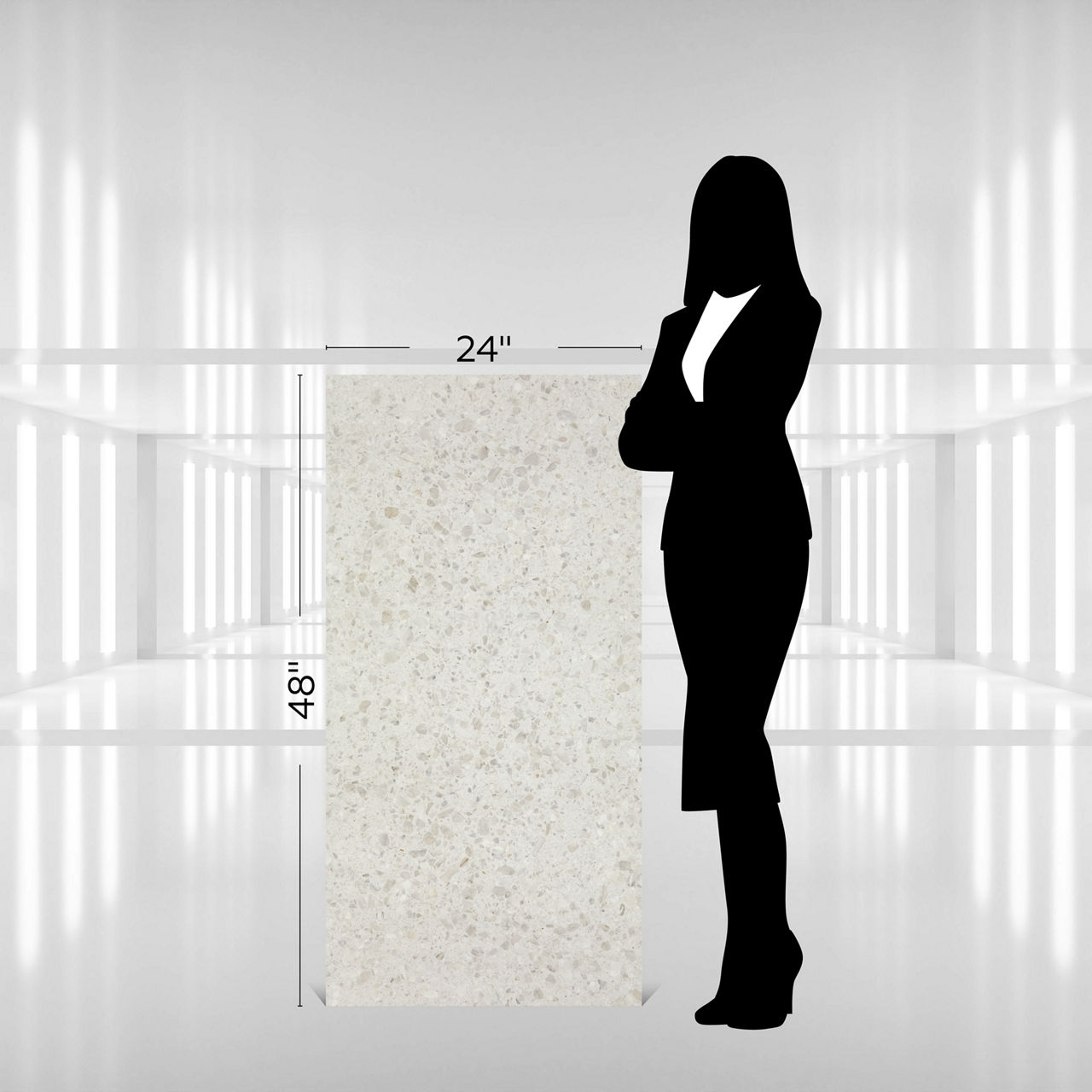 Mid-tone terrazzo-look porcelain tile in Sterling. A 24X48 matte tile with Medio pattern for modern design.