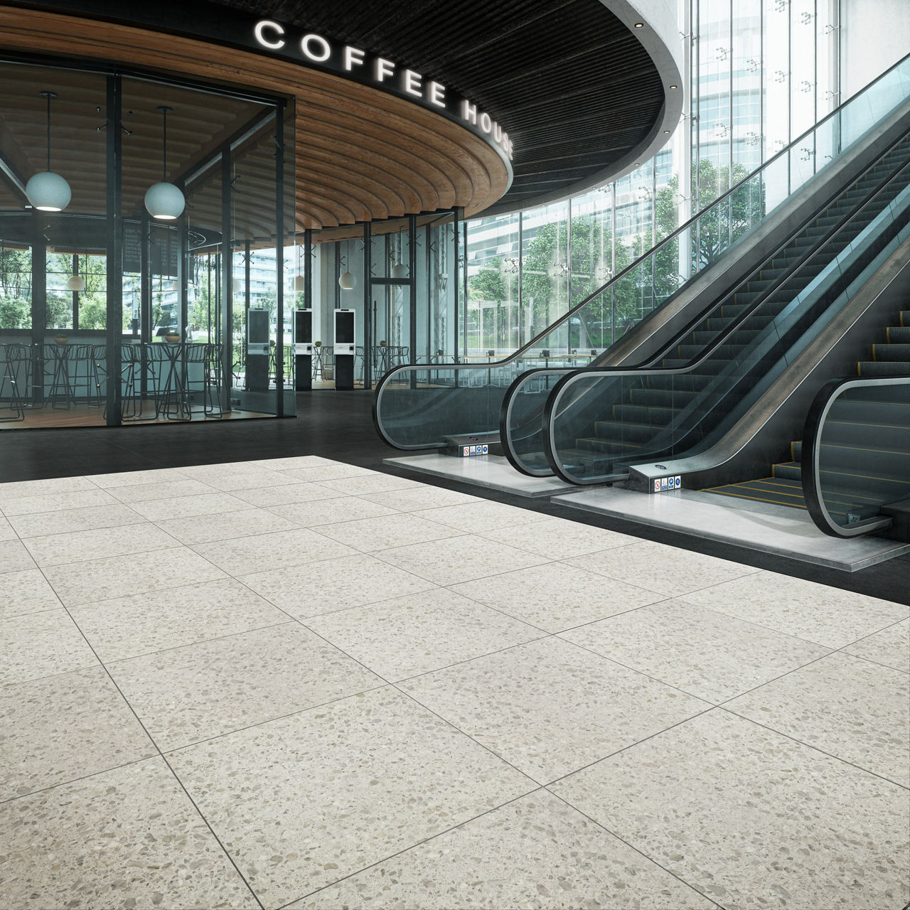 Mid-tone terrazzo-look porcelain tile in Sterling. A 24X24 matte tile with Medio pattern for modern design.
