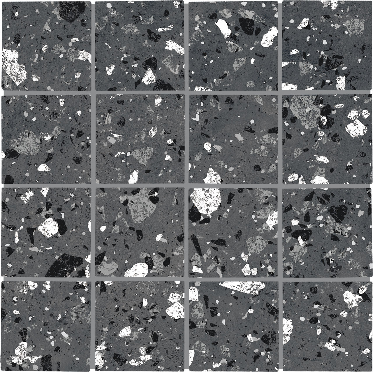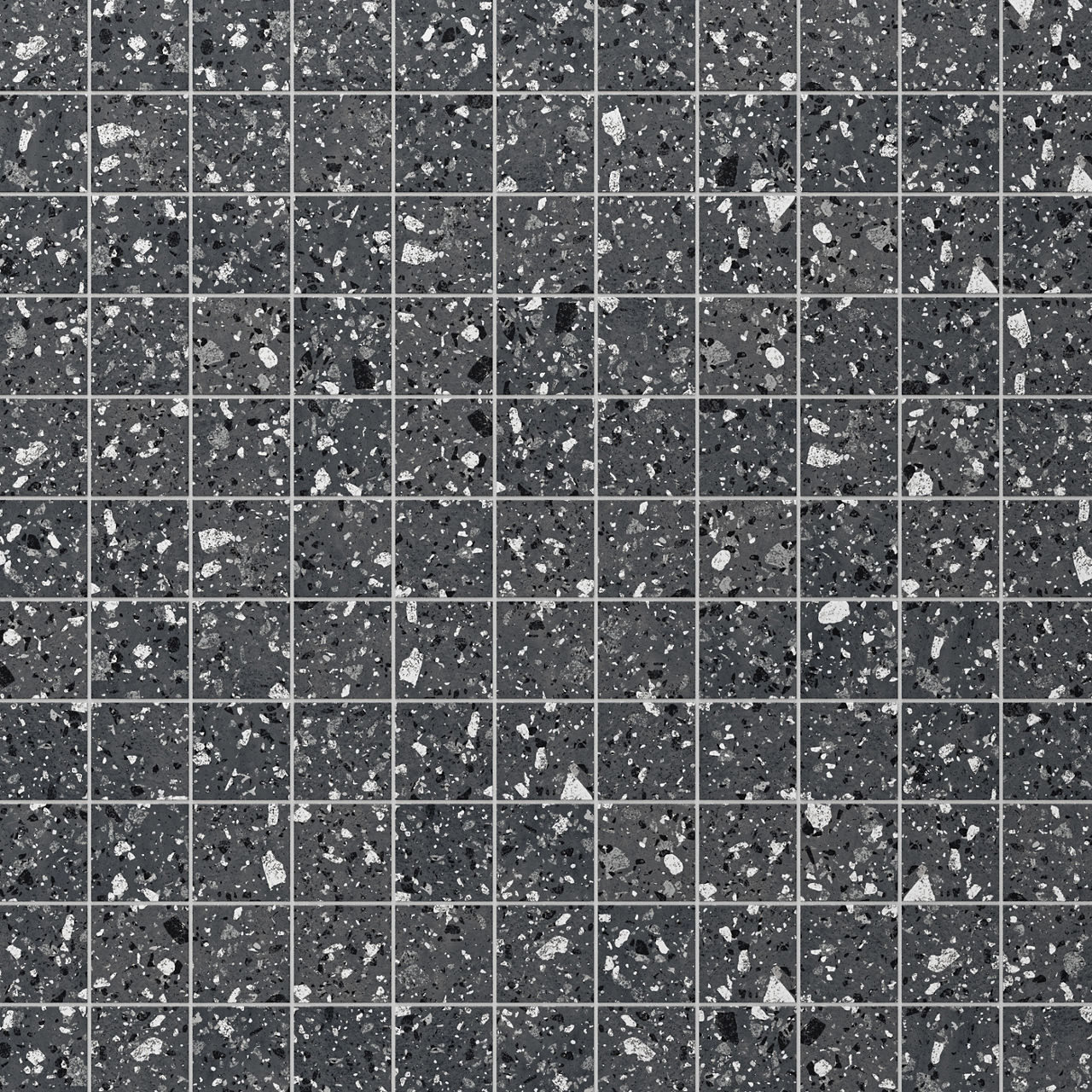 Poke Raven Flecks 3x3 matte black porcelain mosaic tile features a straight joint design with a terrazzo look and speckled detail. Designed in a 3x3 format, it offers a modern aesthetic. Its matte finish enhances a natural look, making it ideal for showers, floors, and backsplashes. A perfect choice for contemporary spaces.
