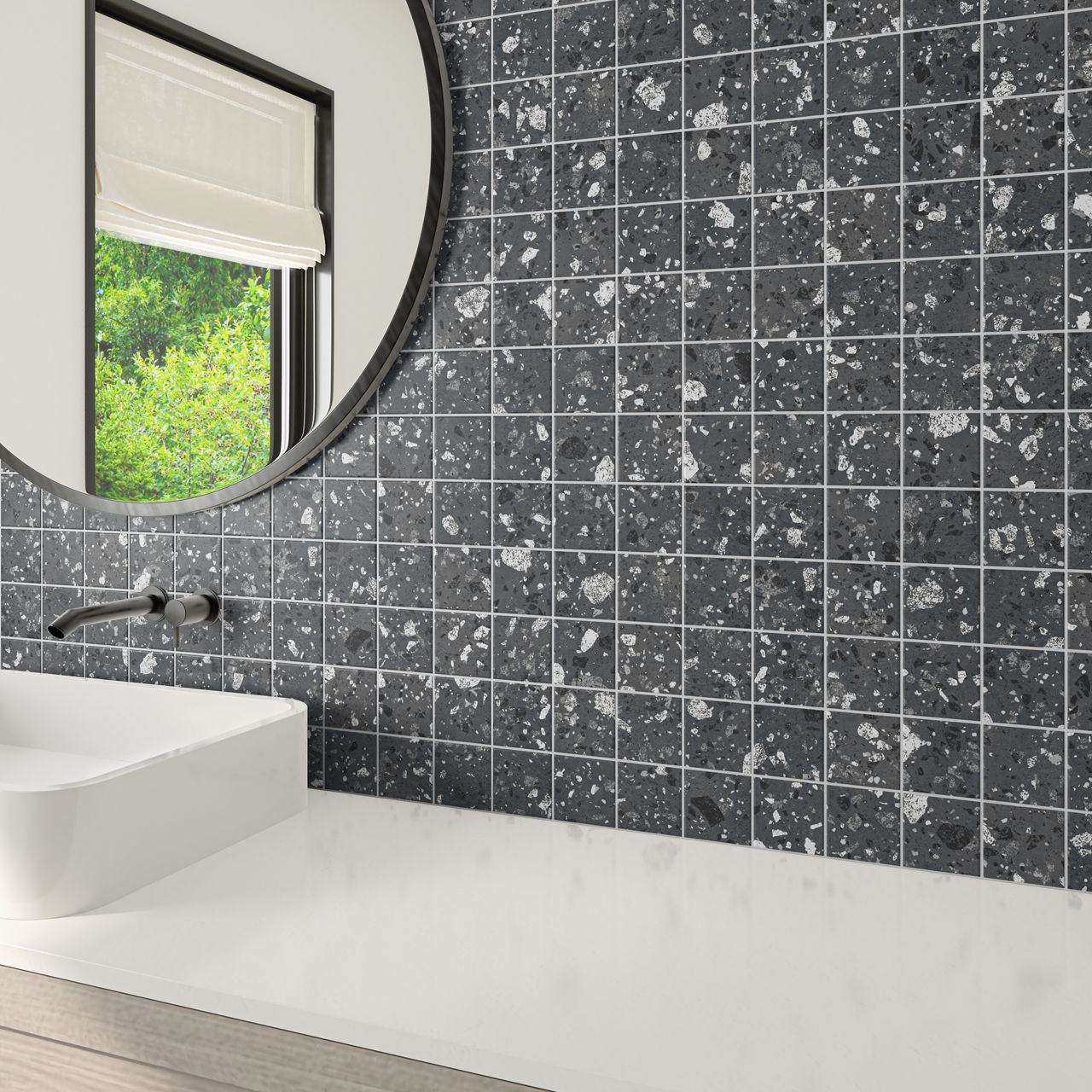 This black terrazzo-look porcelain mosaic tile offers a straight joint design with durable style for showers, floors, and backsplashes.