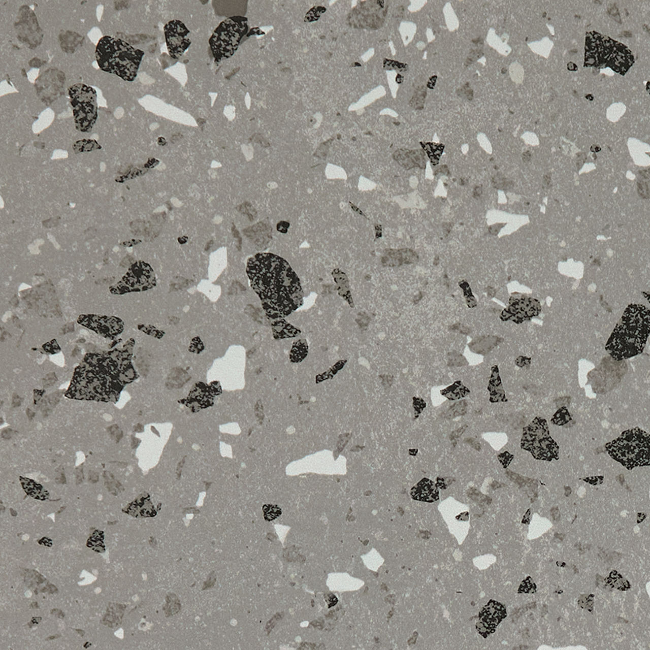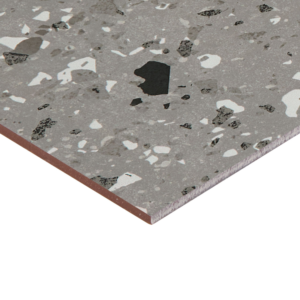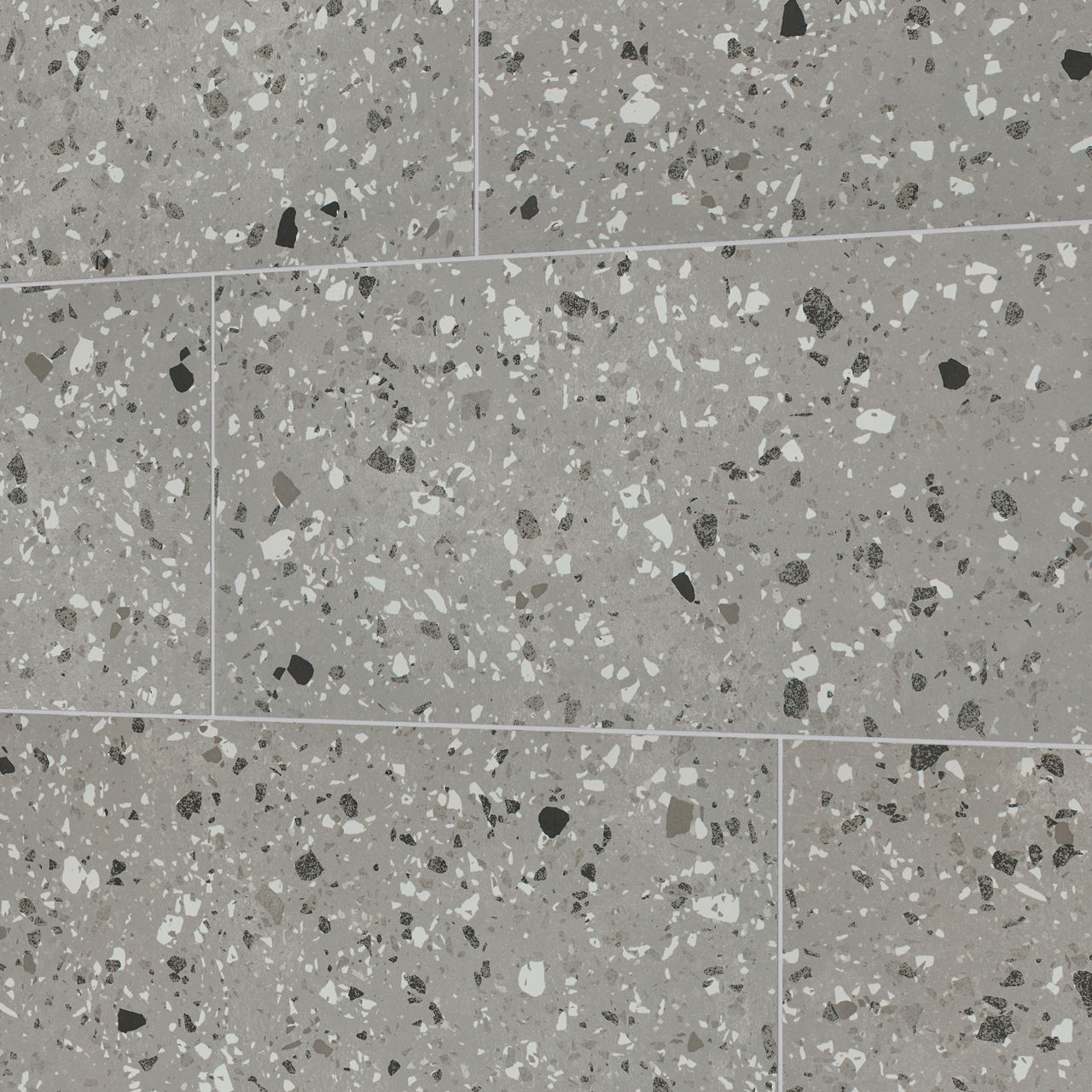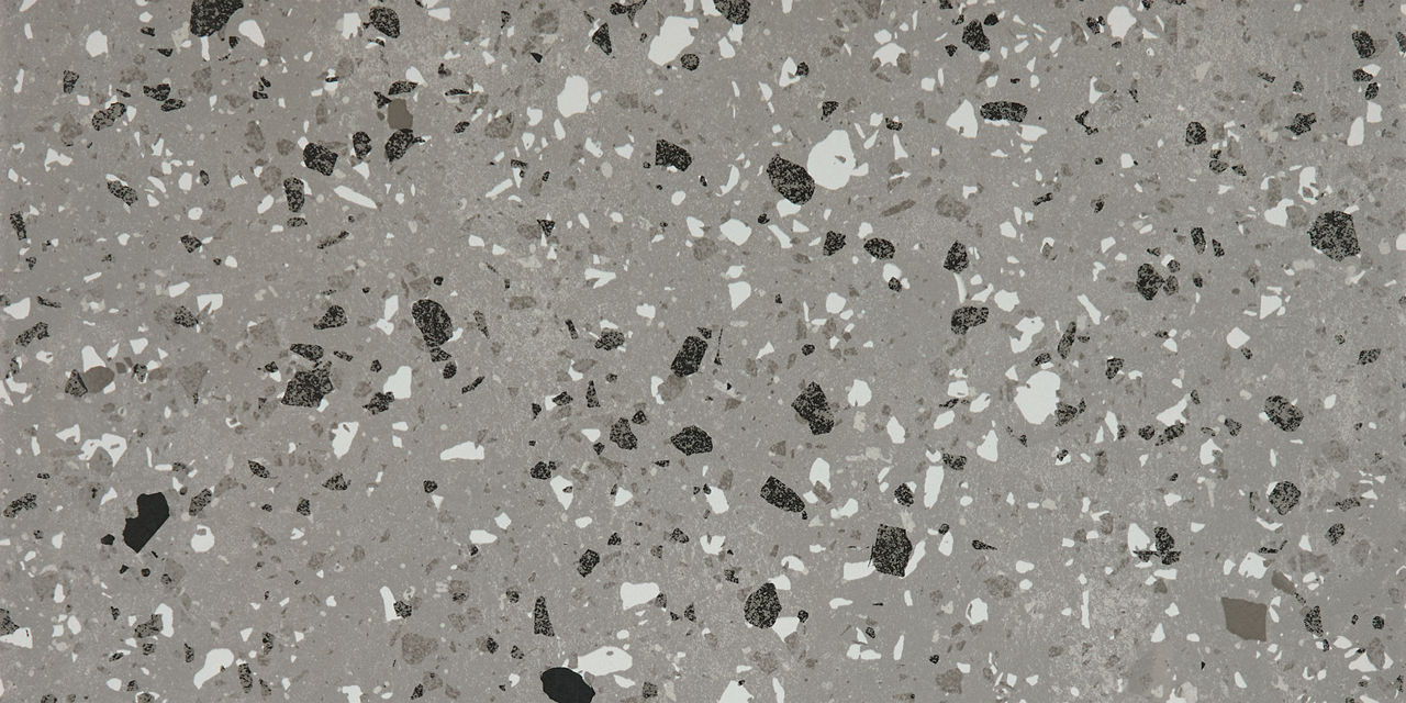 This gray terrazzo-look porcelain tile pairs speckled texture with matte durability for versatile interior floors and walls.