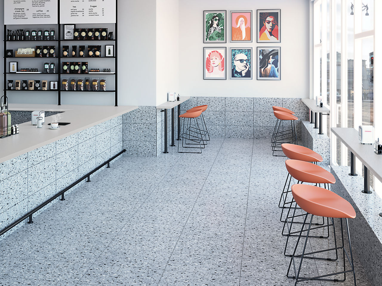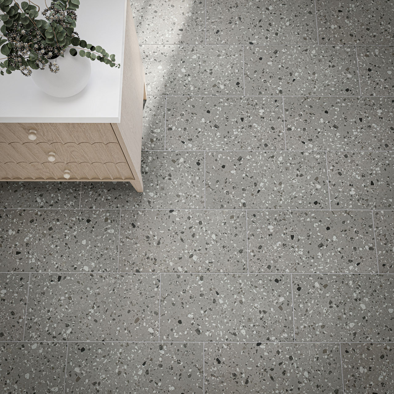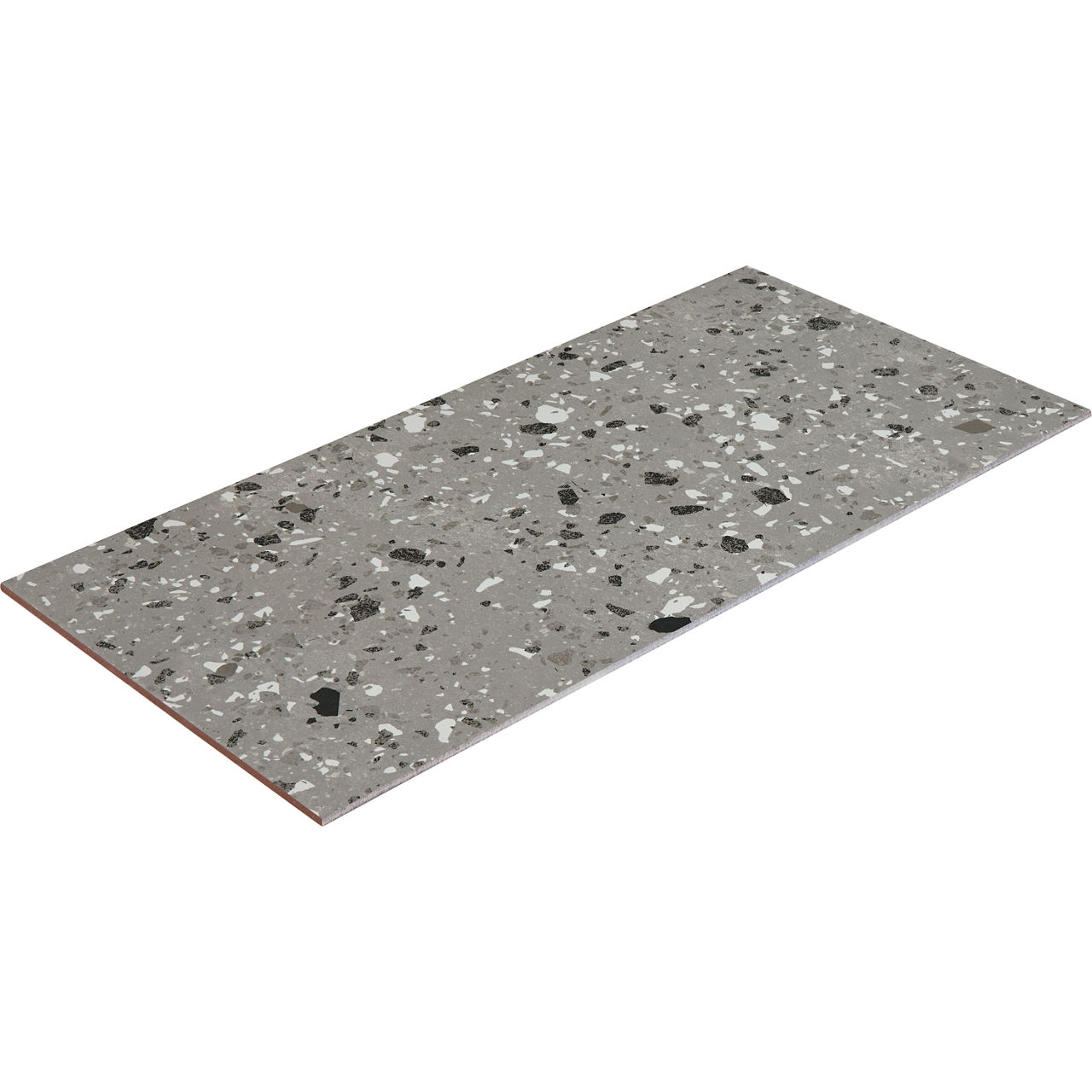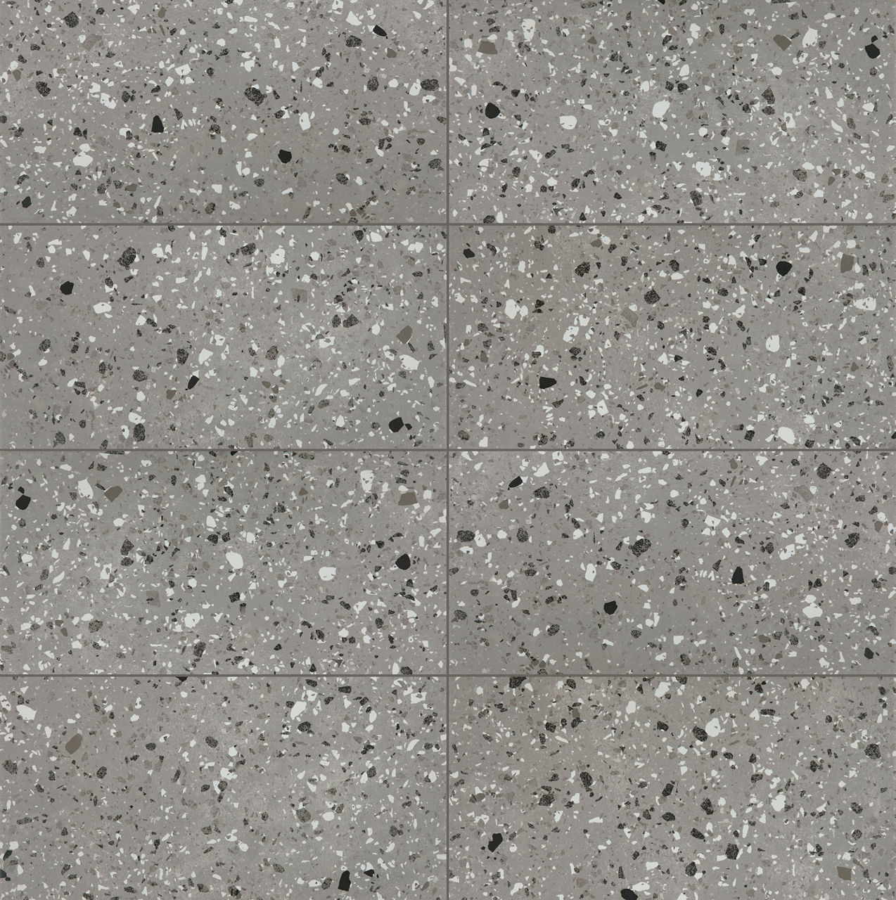 This gray terrazzo-look porcelain tile pairs speckled texture with matte durability for versatile interior floors and walls.