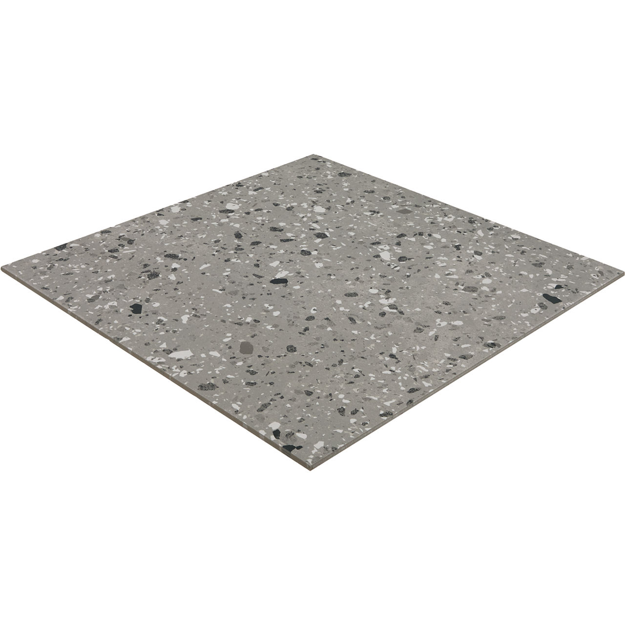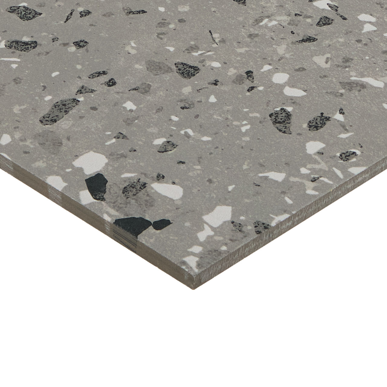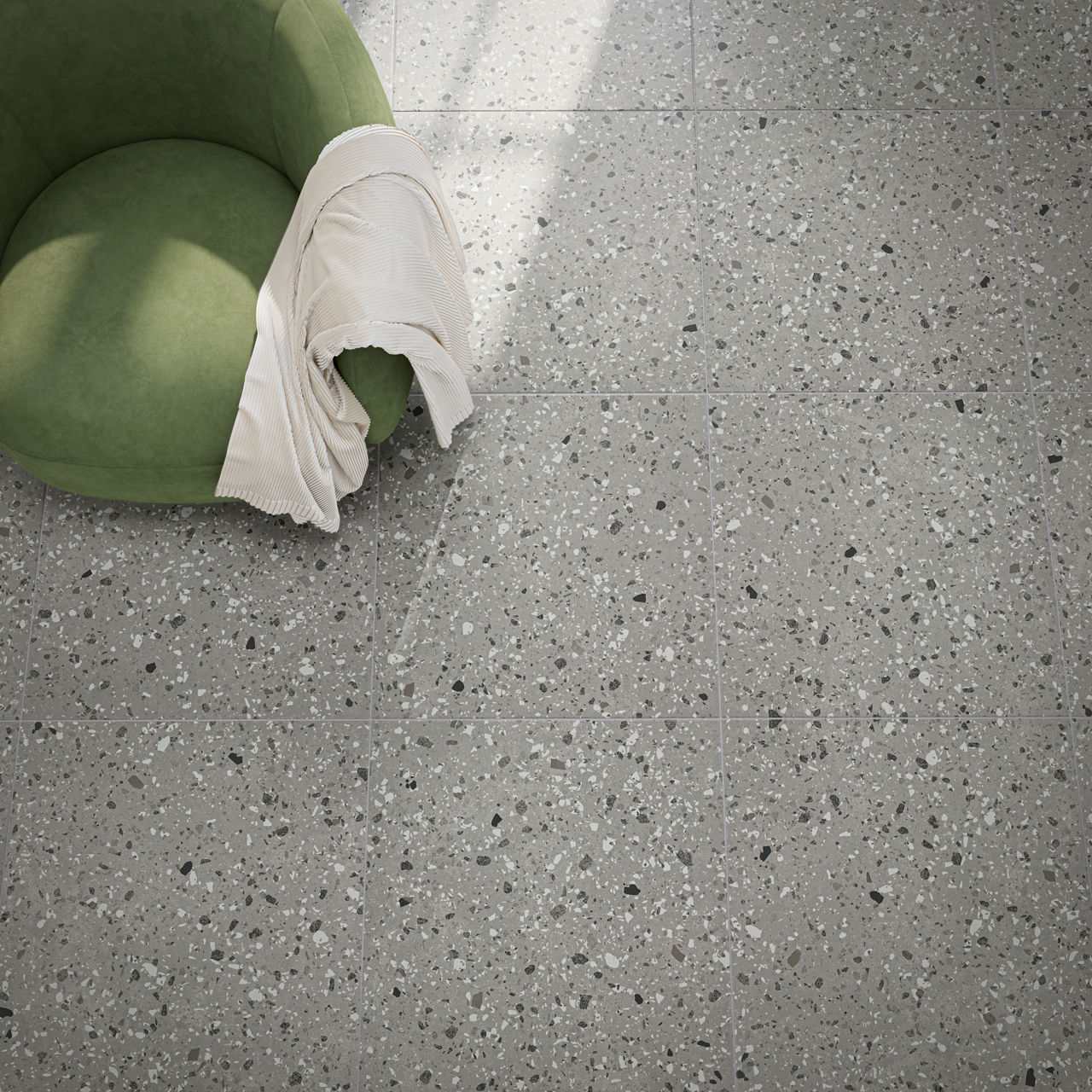 This gray terrazzo-look porcelain tile pairs speckled texture with matte durability for versatile interior floors and walls.