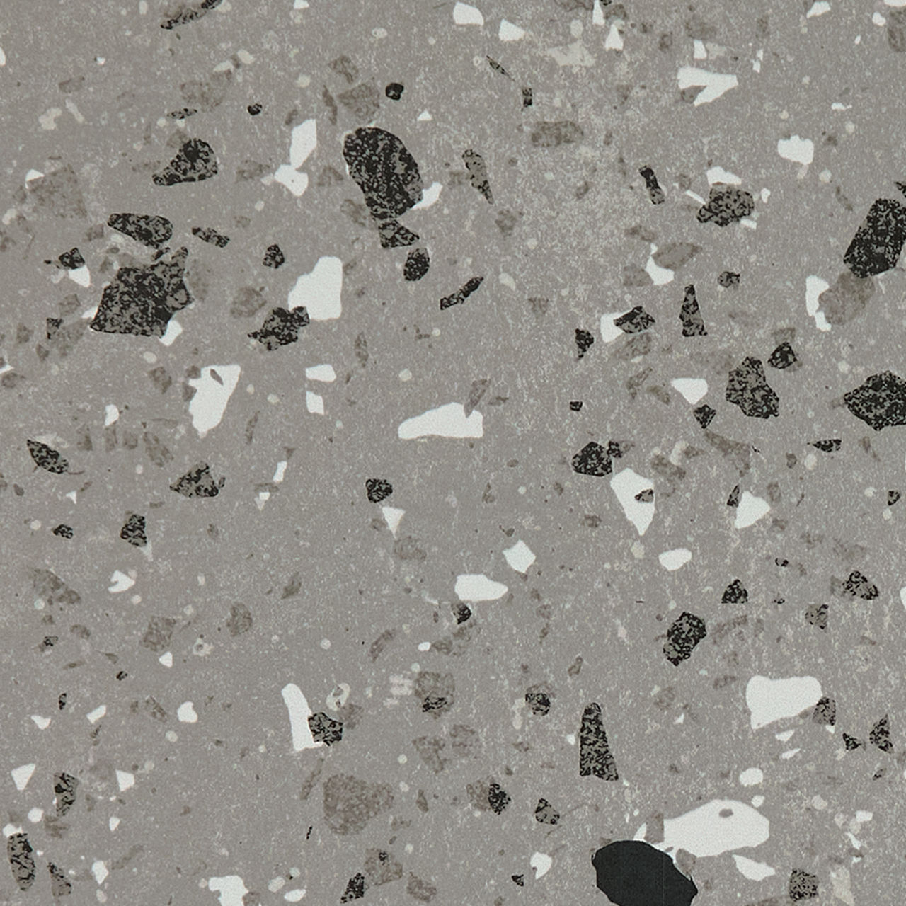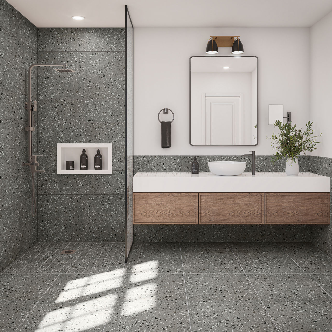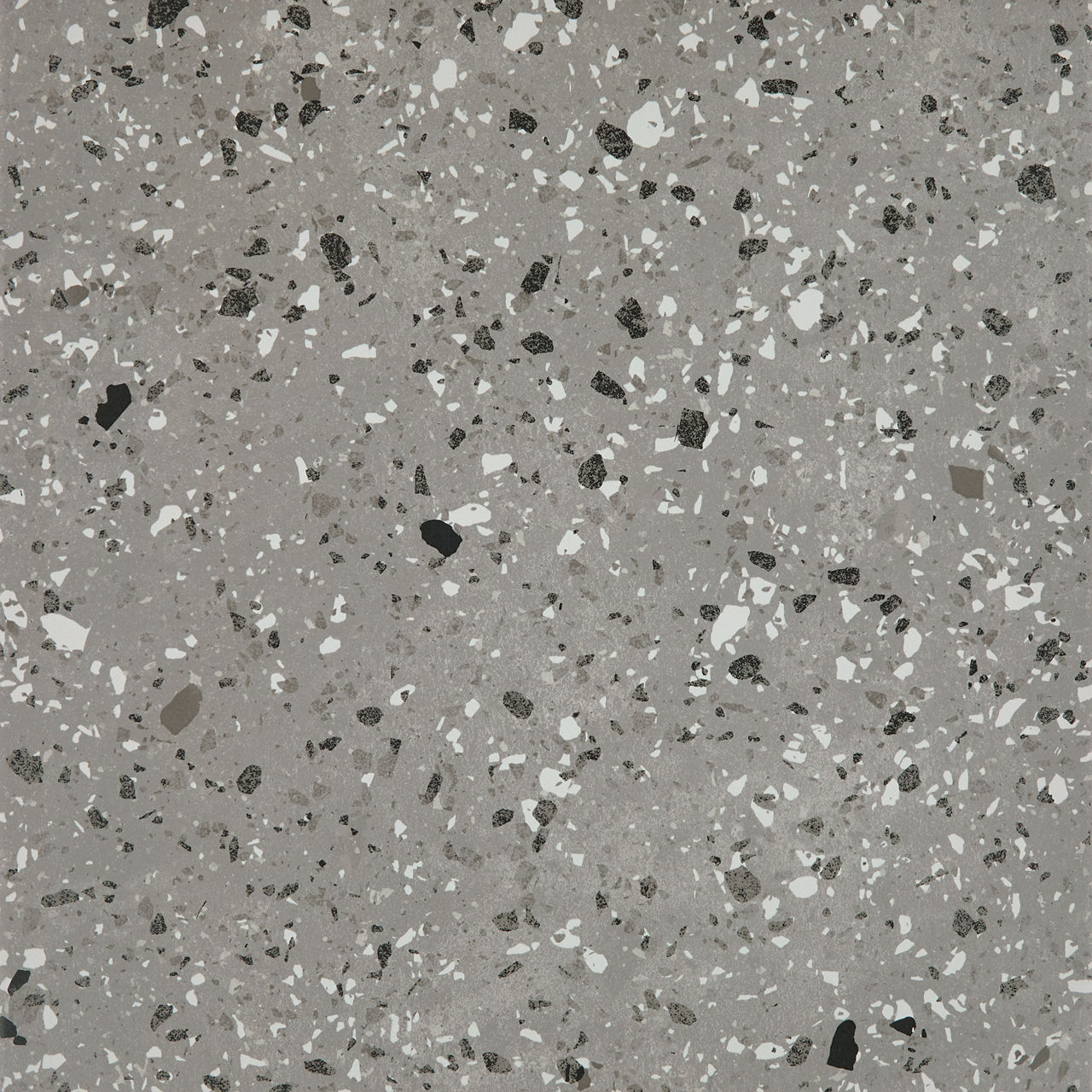 This gray terrazzo-look porcelain tile pairs speckled texture with matte durability for versatile interior floors and walls.