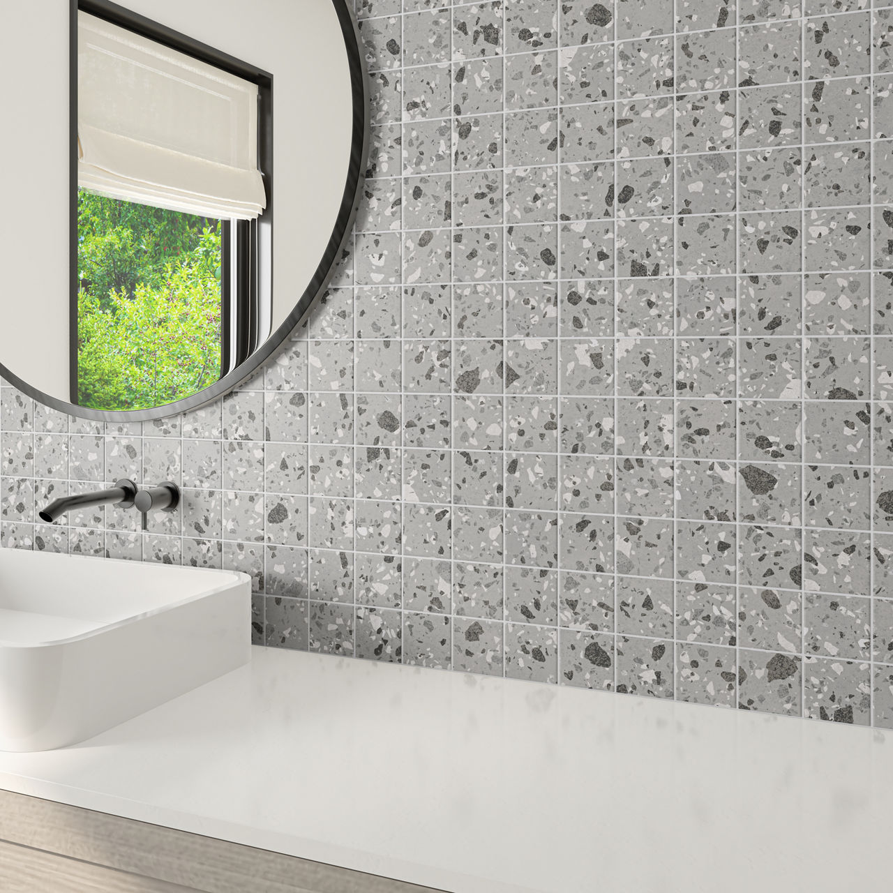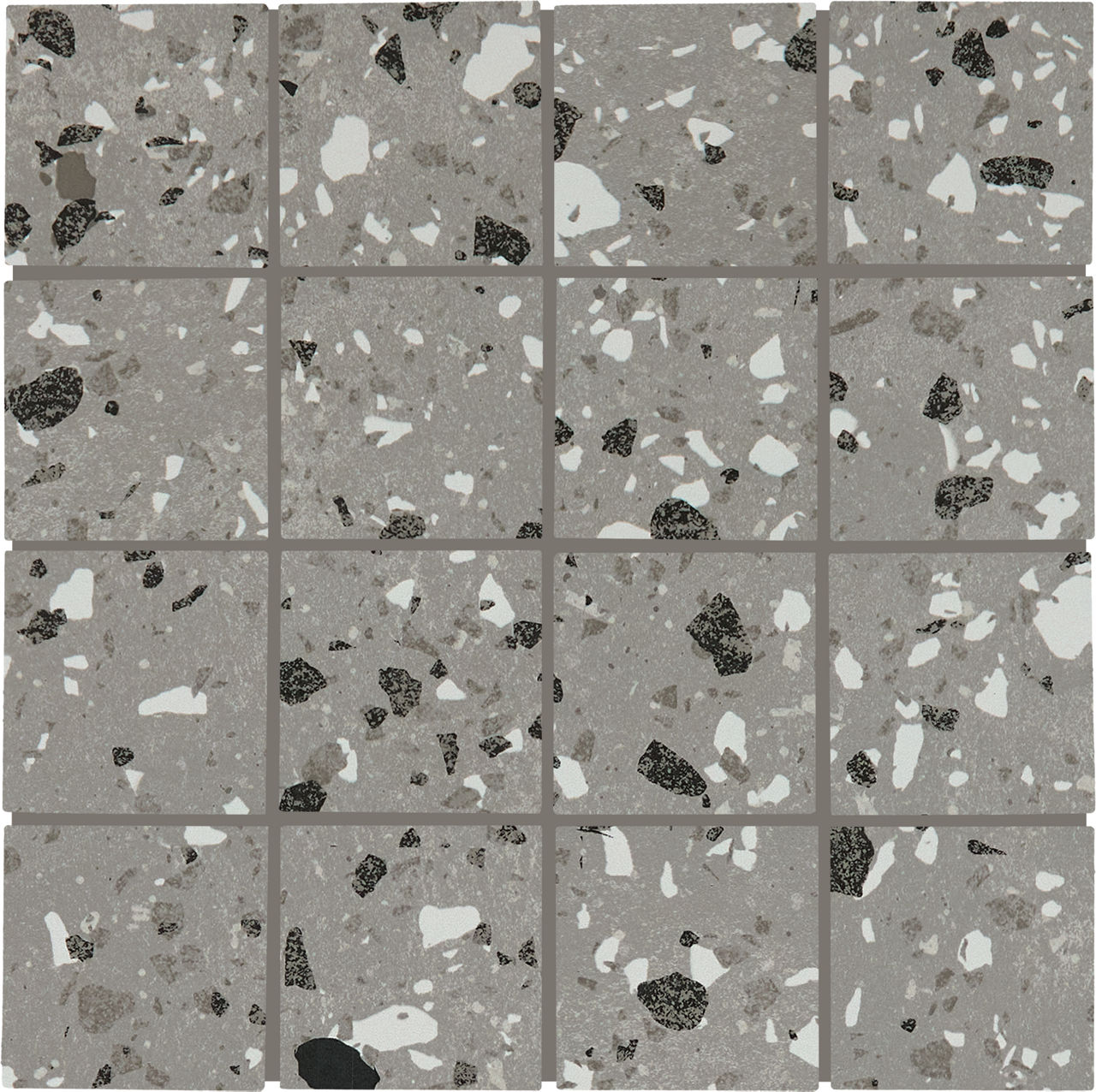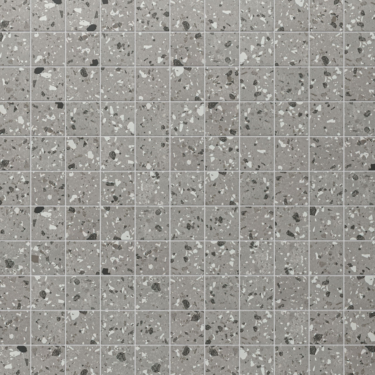 Gray terrazzo-look porcelain mosaic tile in Smoke Flecks. A 3x3 matte mosaic with straight joint design for showers and coordinated surfaces.