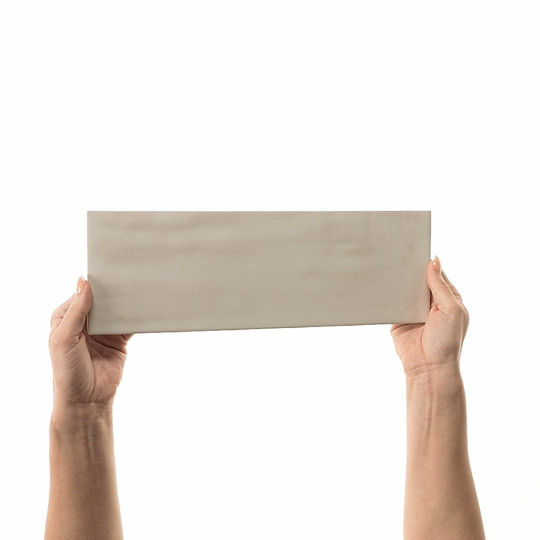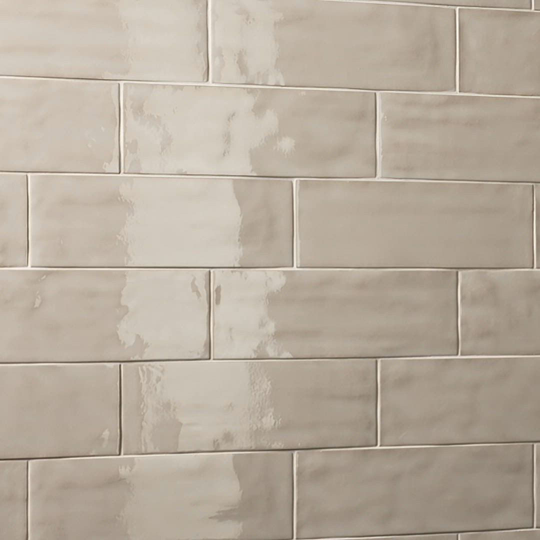 This beige handcrafted ceramic wall tile in a 4x12 format delivers warm tonal variation with a sleek, glossy surface for contemporary walls.