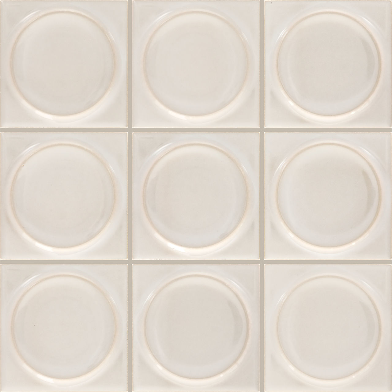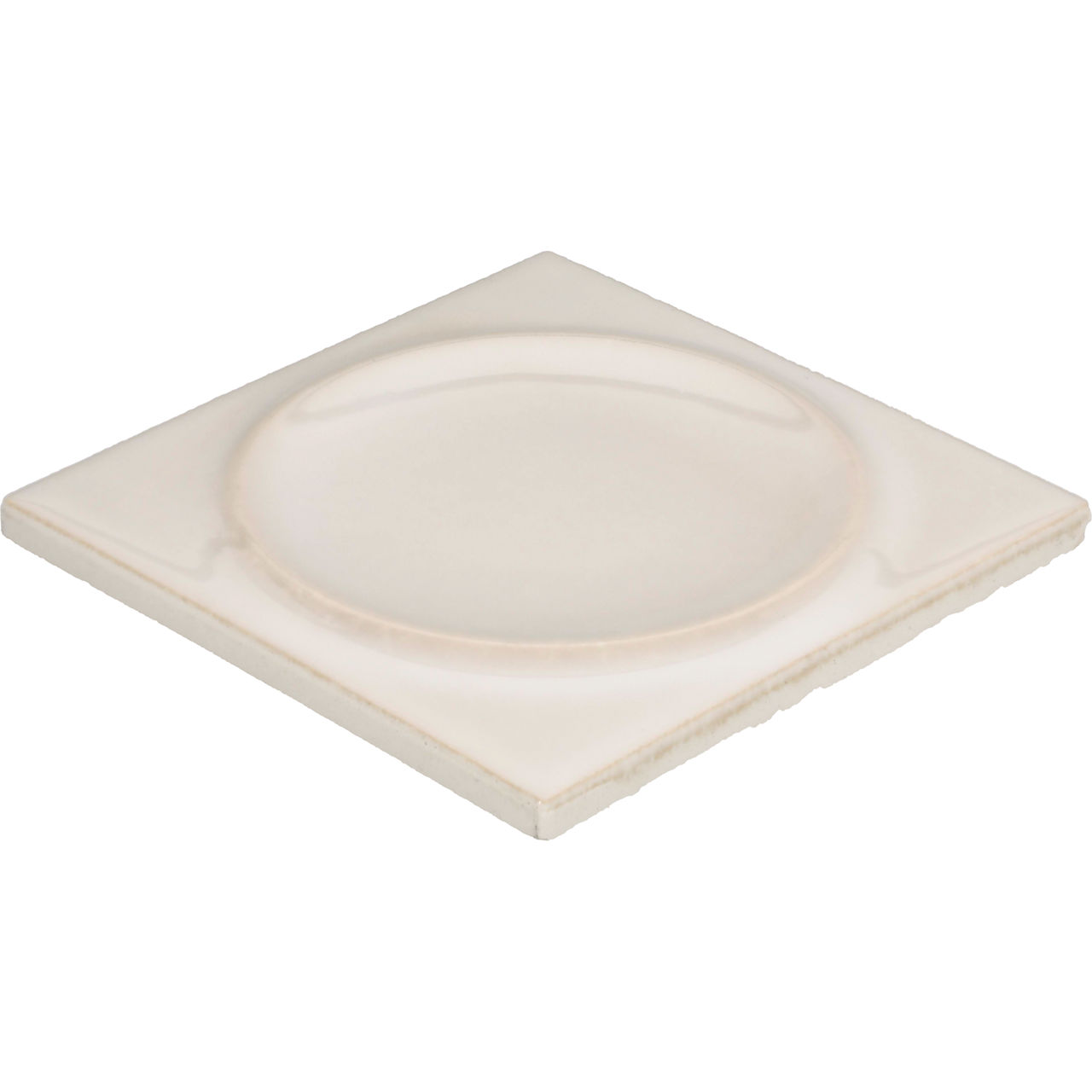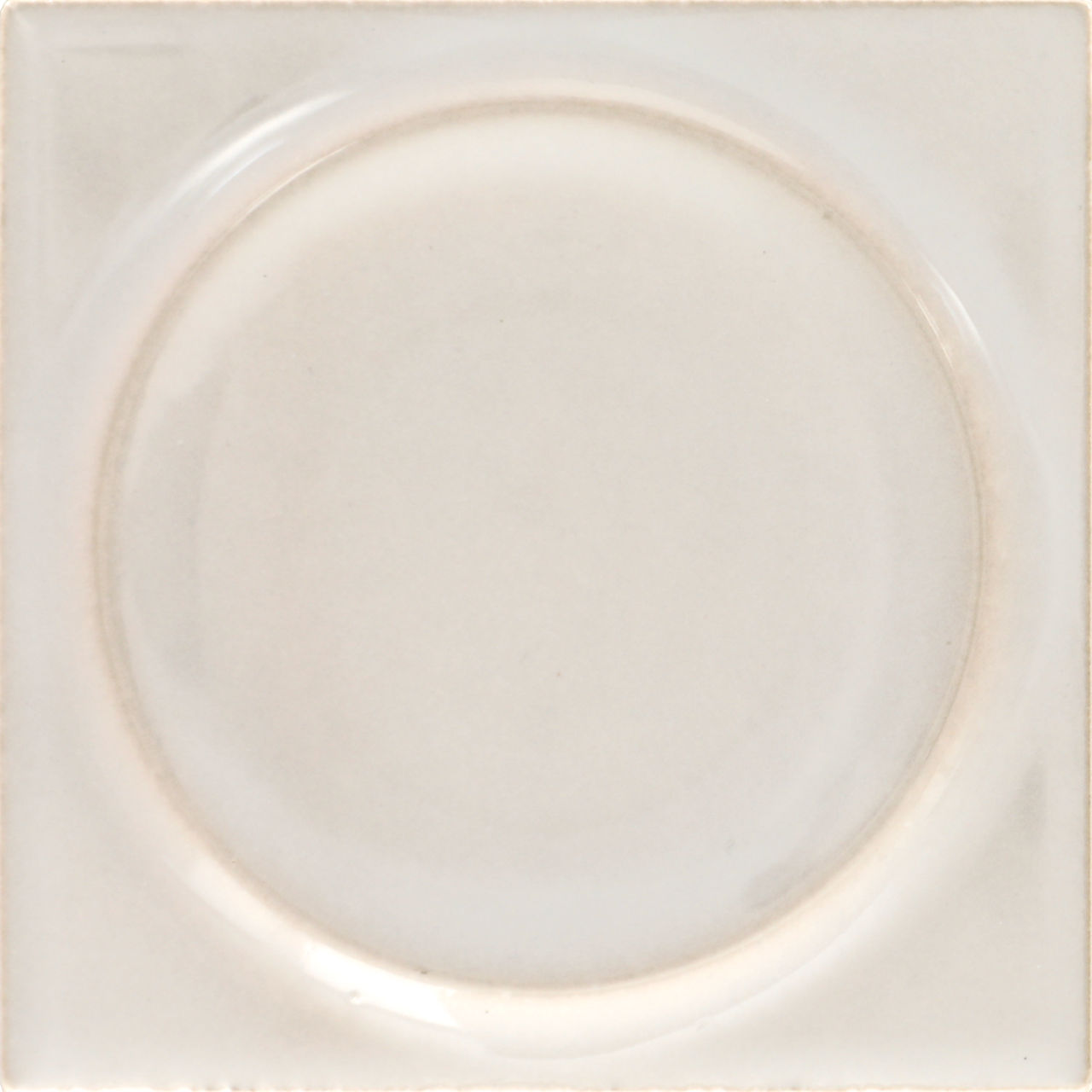 Beige ceramic wall tile in Bone. A 4x4 glossy tile with circular detail for warm, modern wall styling.