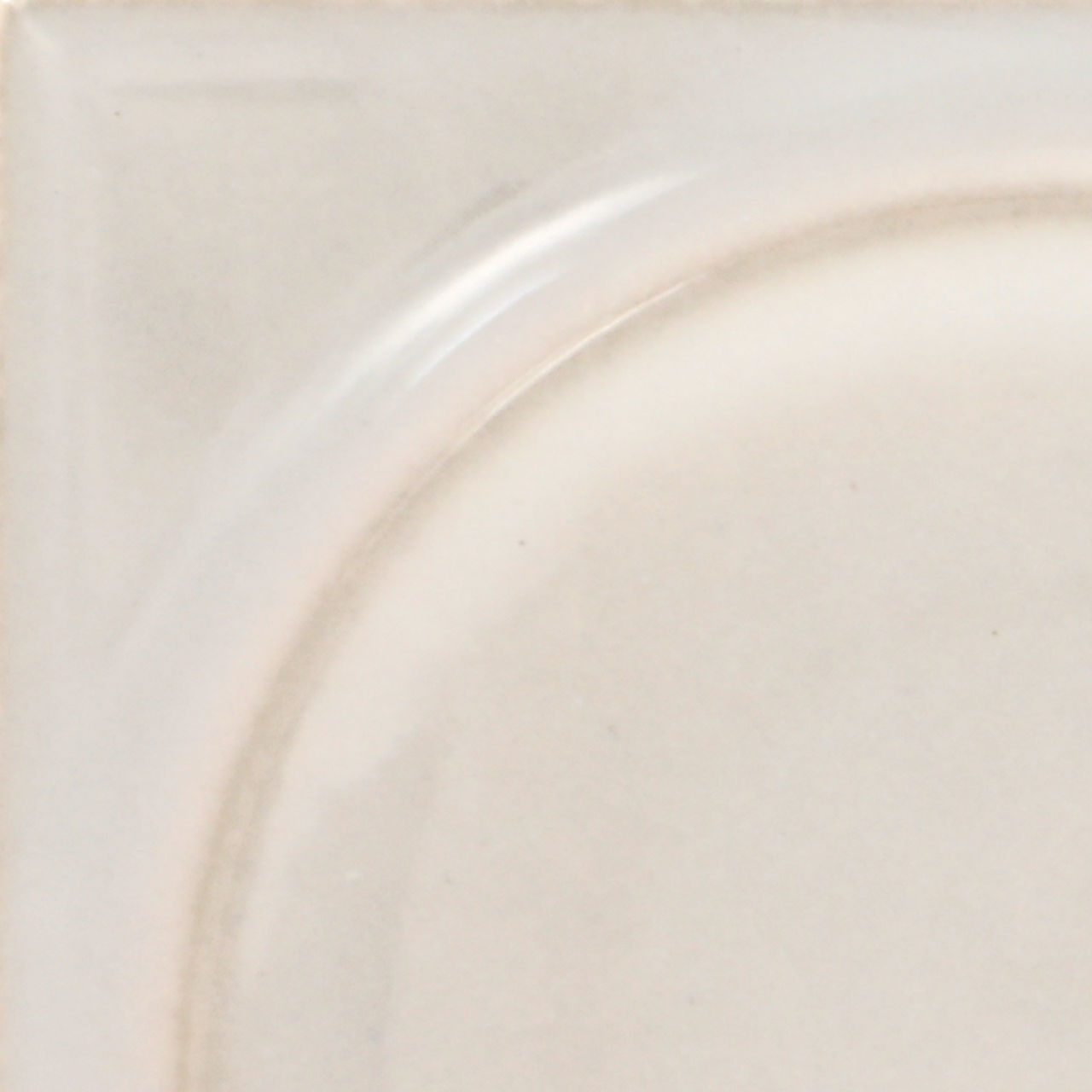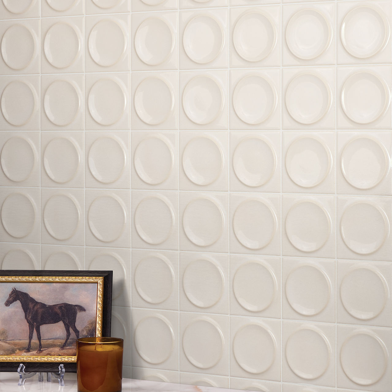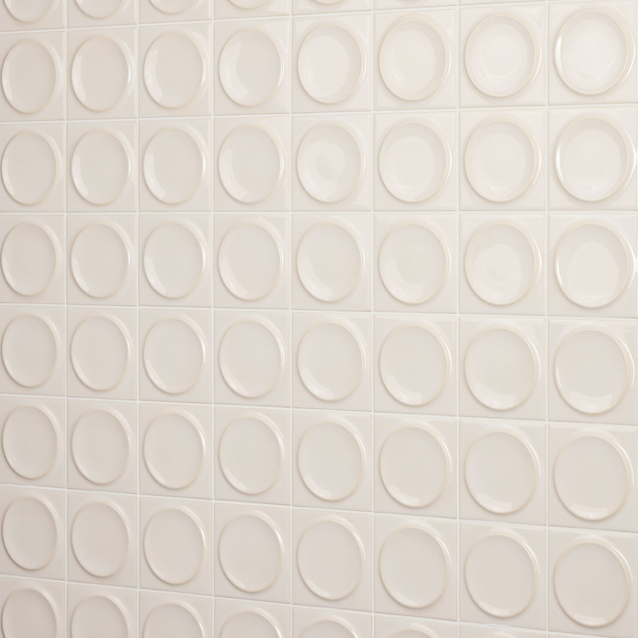 Beige ceramic wall tile in Bone. A 4x4 glossy tile with circular detail for warm, modern wall styling.