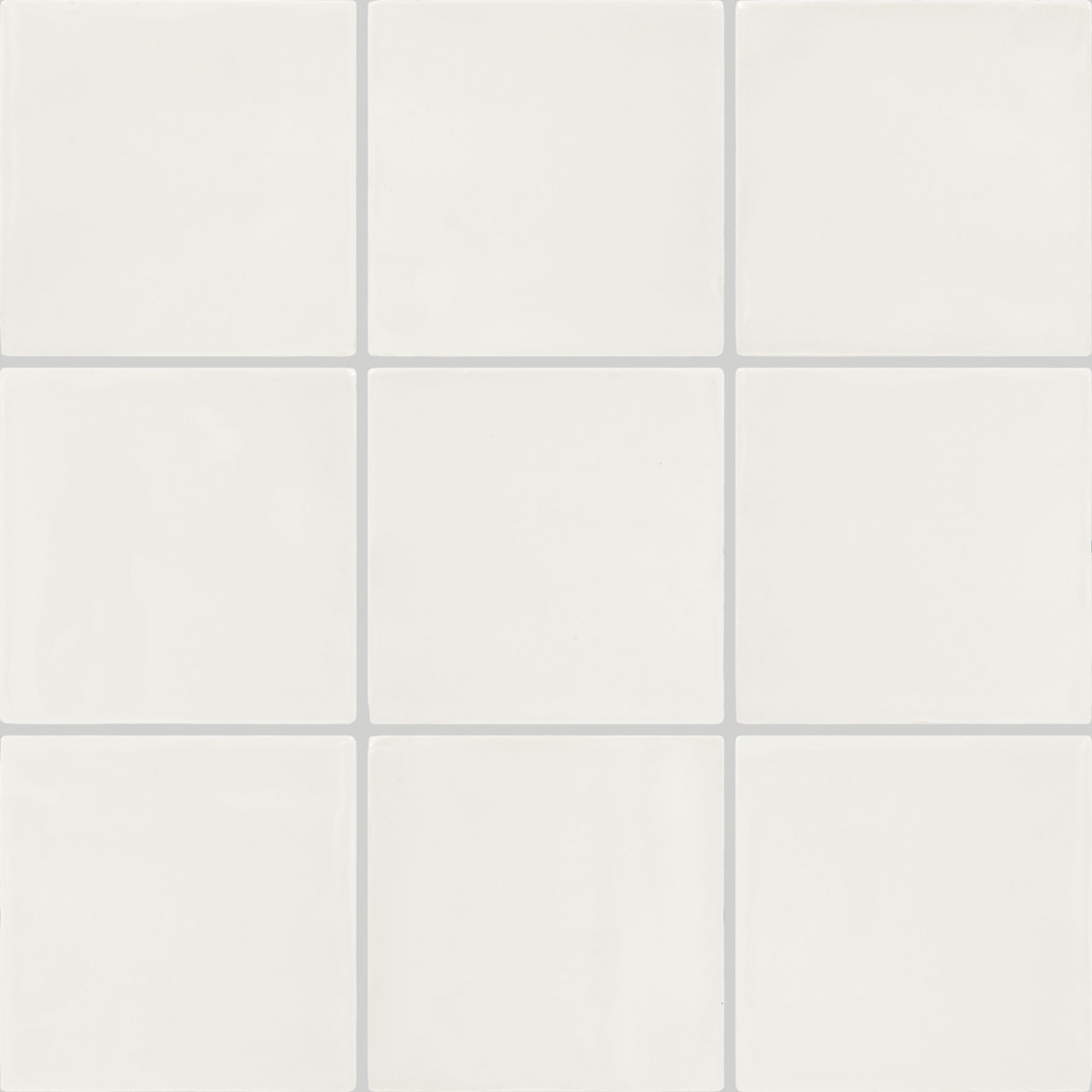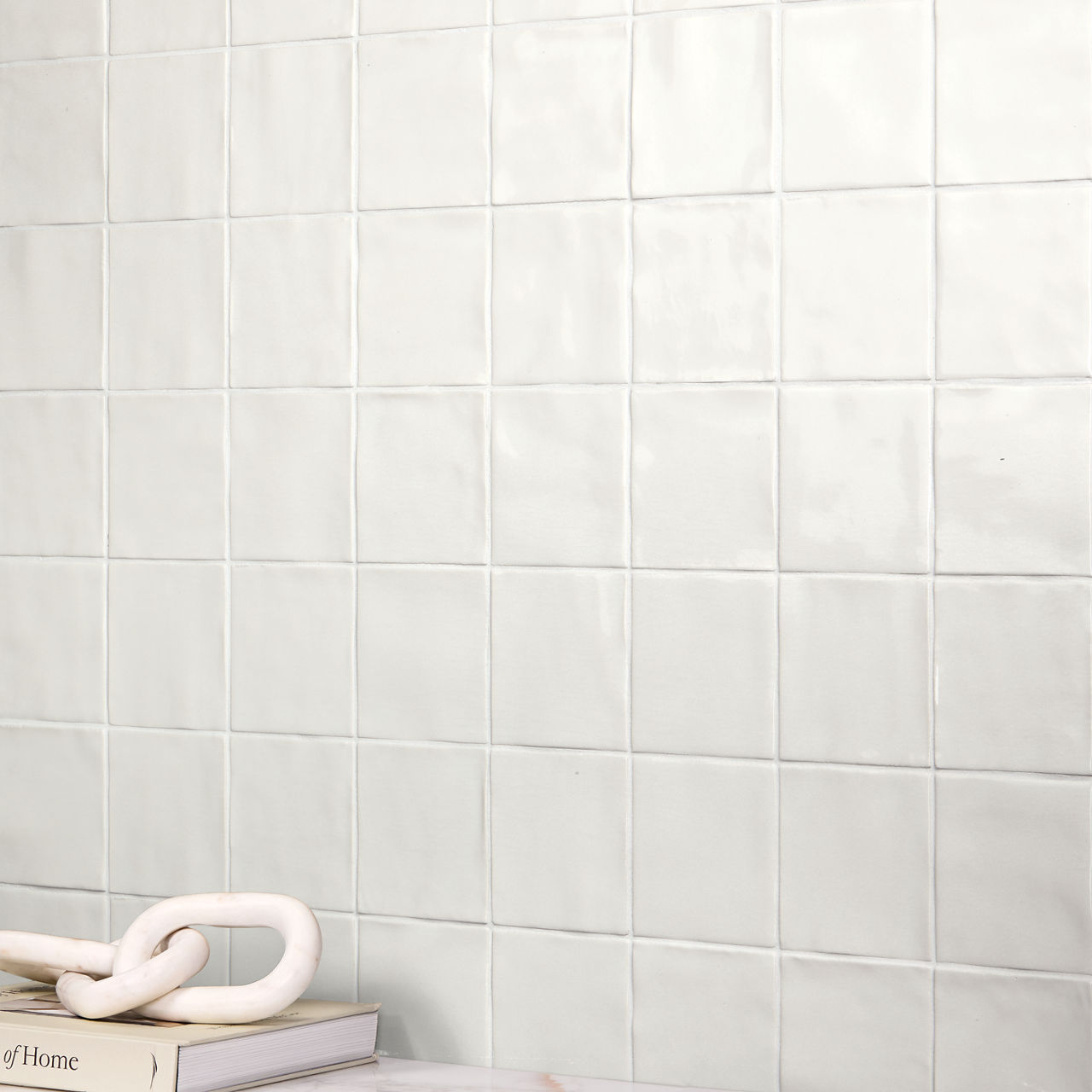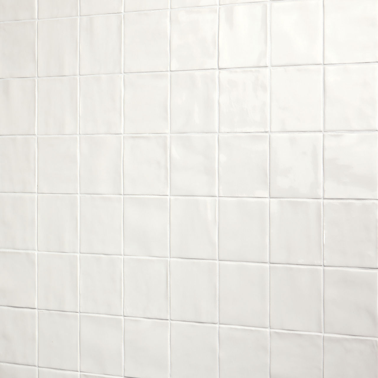 White ceramic wall tile in Powder. A 4x4 glossy tile with handcrafted texture for soft movement and versatile wall design.