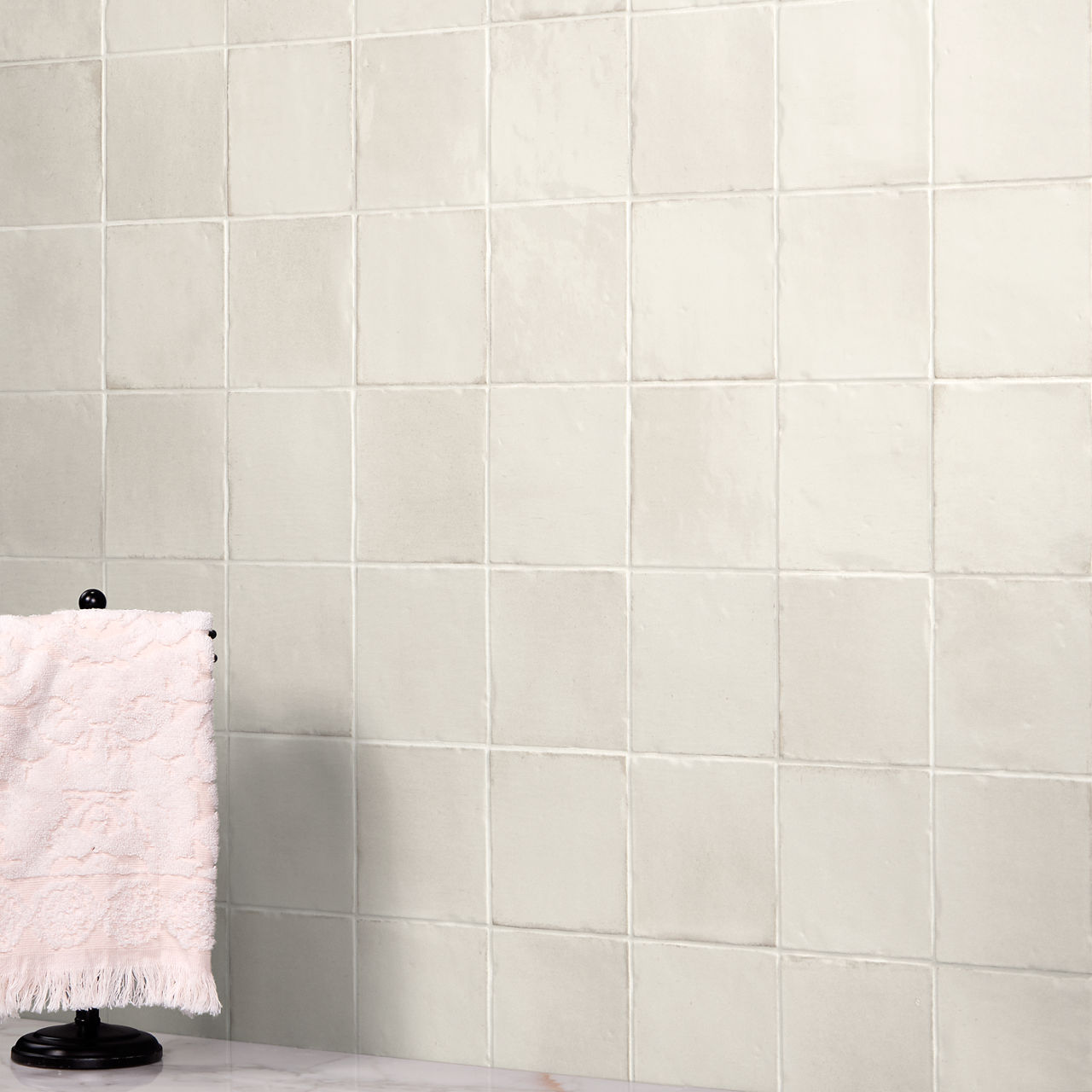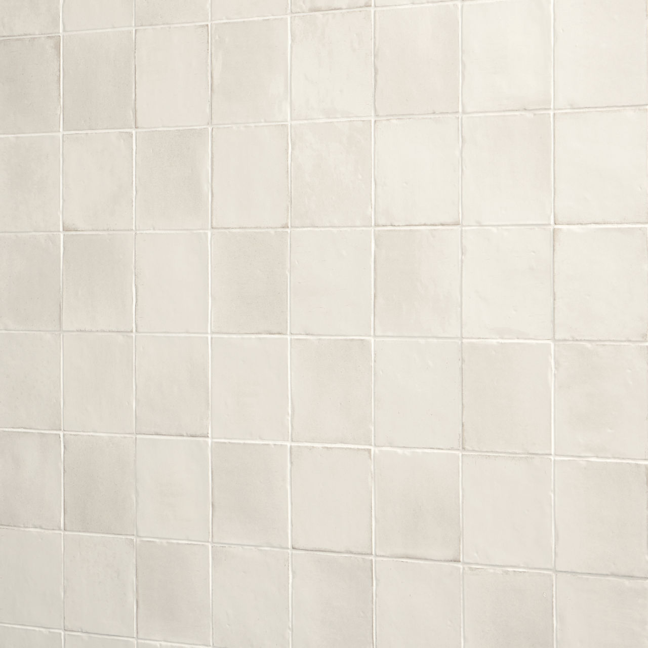 White ceramic wall tile in Deckle. A 4x4 glossy tile with handcrafted texture for classic wall and backsplash design.