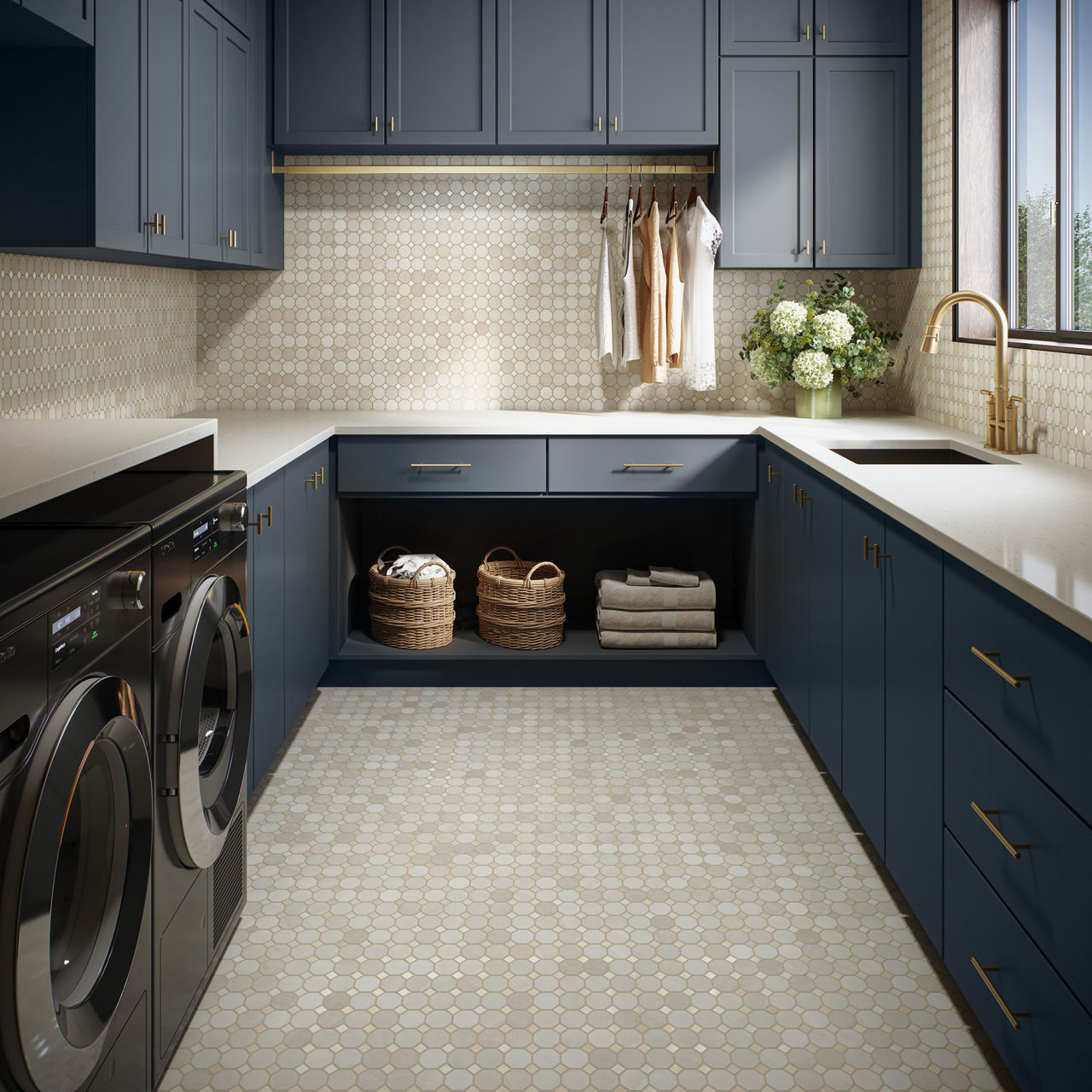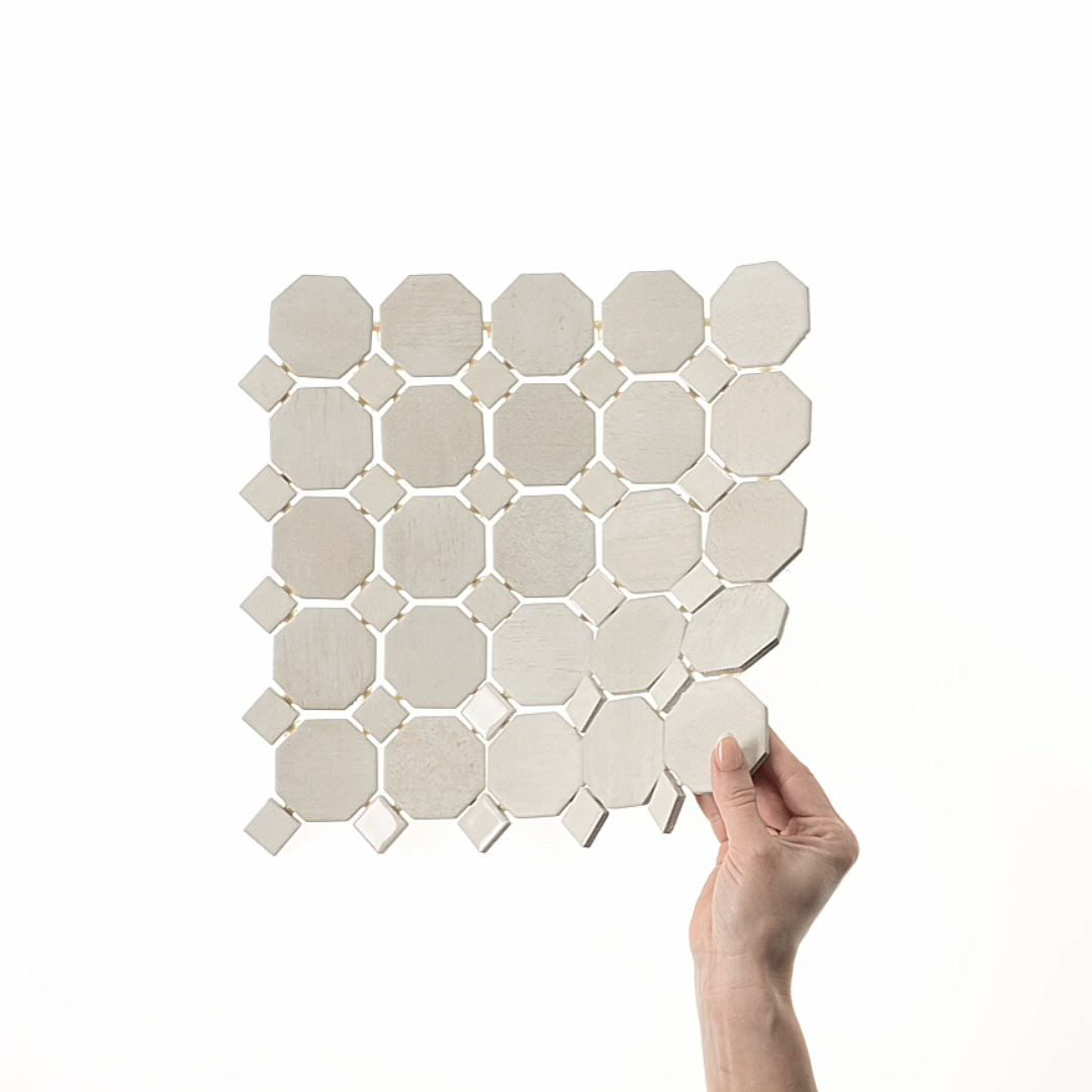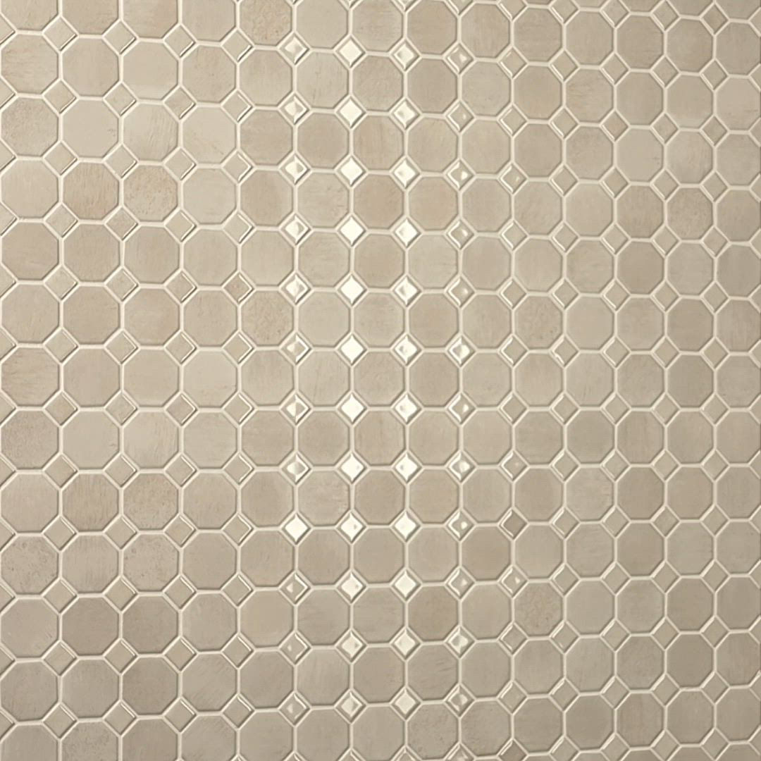 Beige porcelain mosaic tile in Unbound. A size mixed-finish octagon and dot mosaic for timeless floors, showers, and backsplashes.