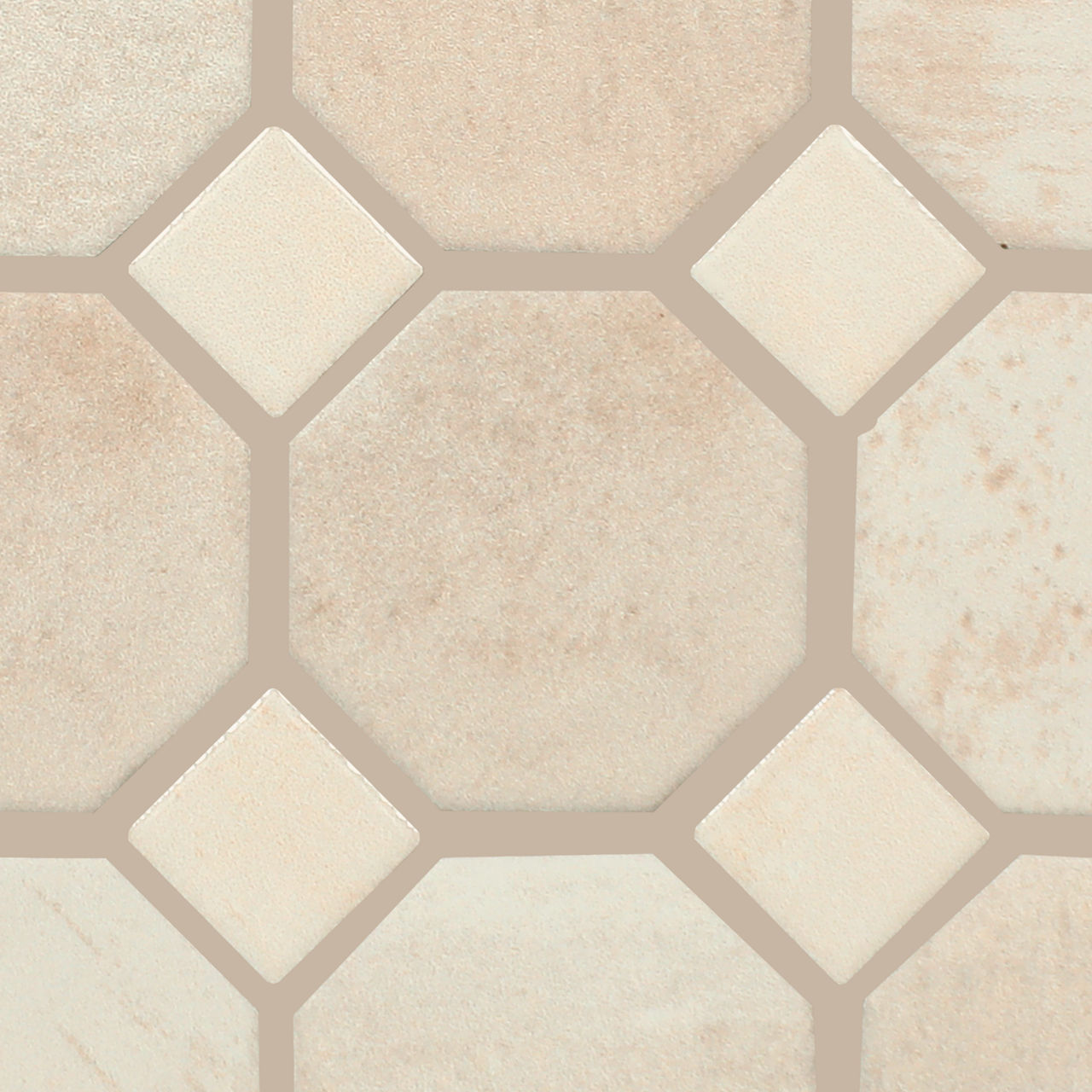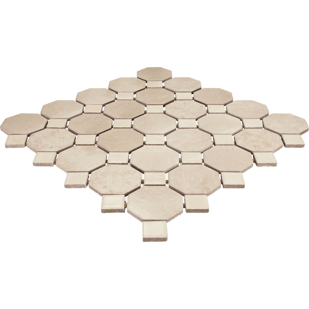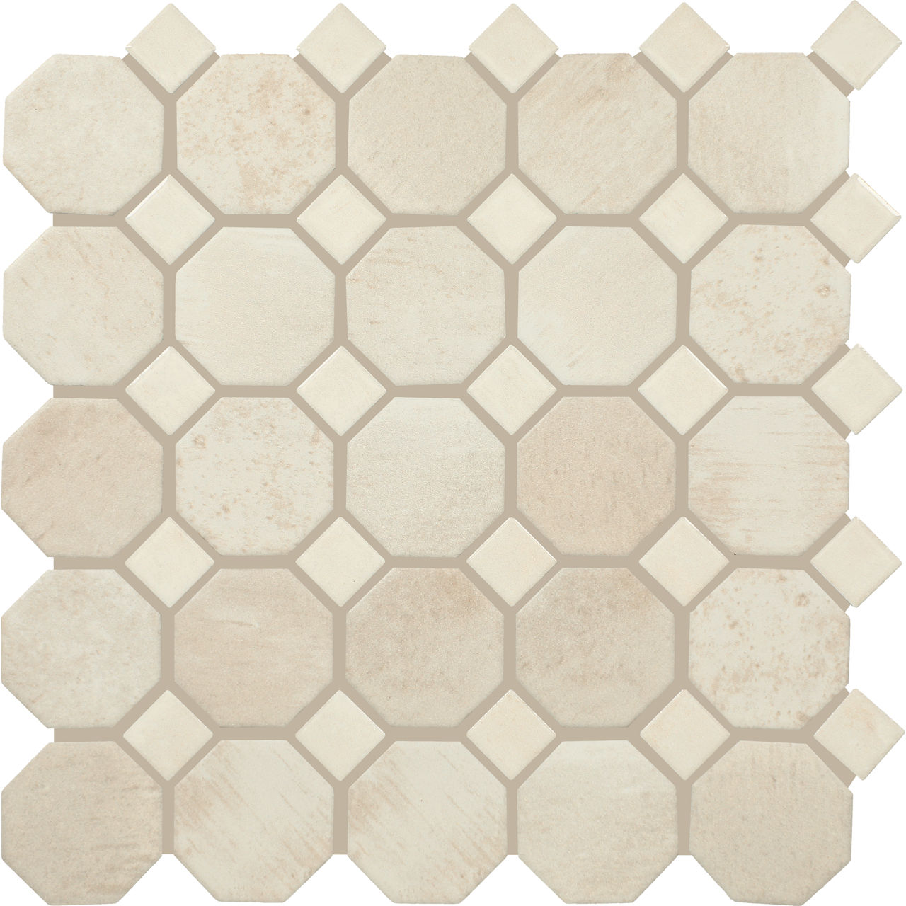 Relicca Unbound 2 mixed beige porcelain mosaic tile features an octagon and dot design with a heritage-inspired look. Designed in a 2 format, it offers classic character with versatile appeal. Its mixed finish enhances visual interest and timeless style, making it ideal for showers, floors, and backsplashes. A perfect choice for traditional and vintage-inspired spaces.