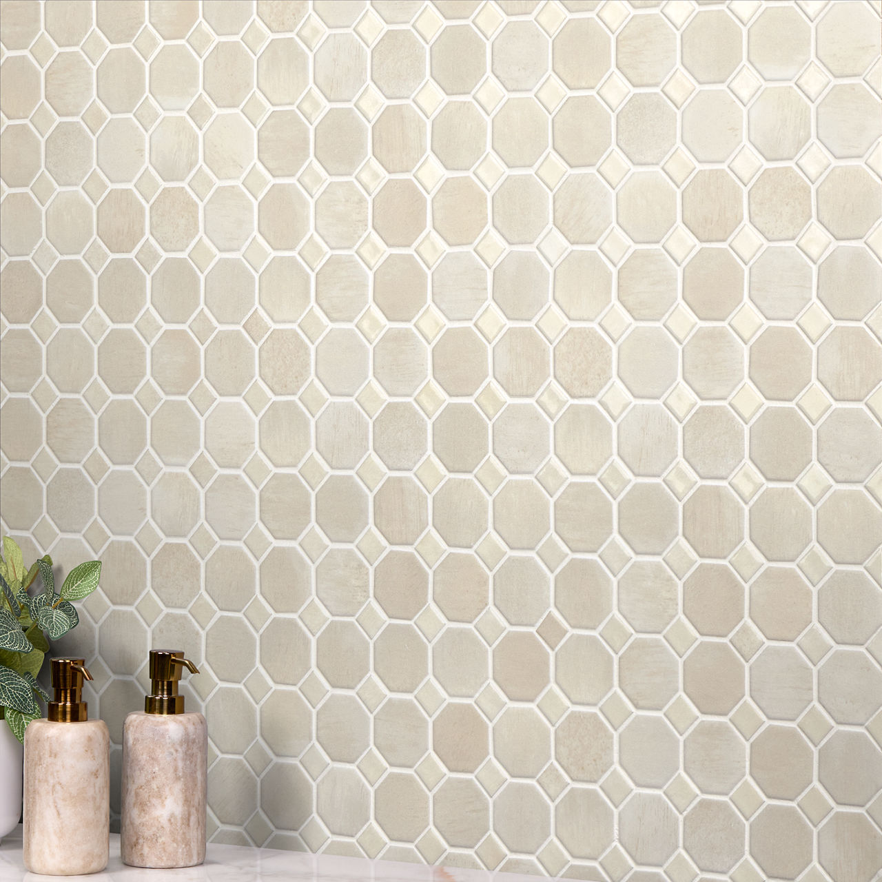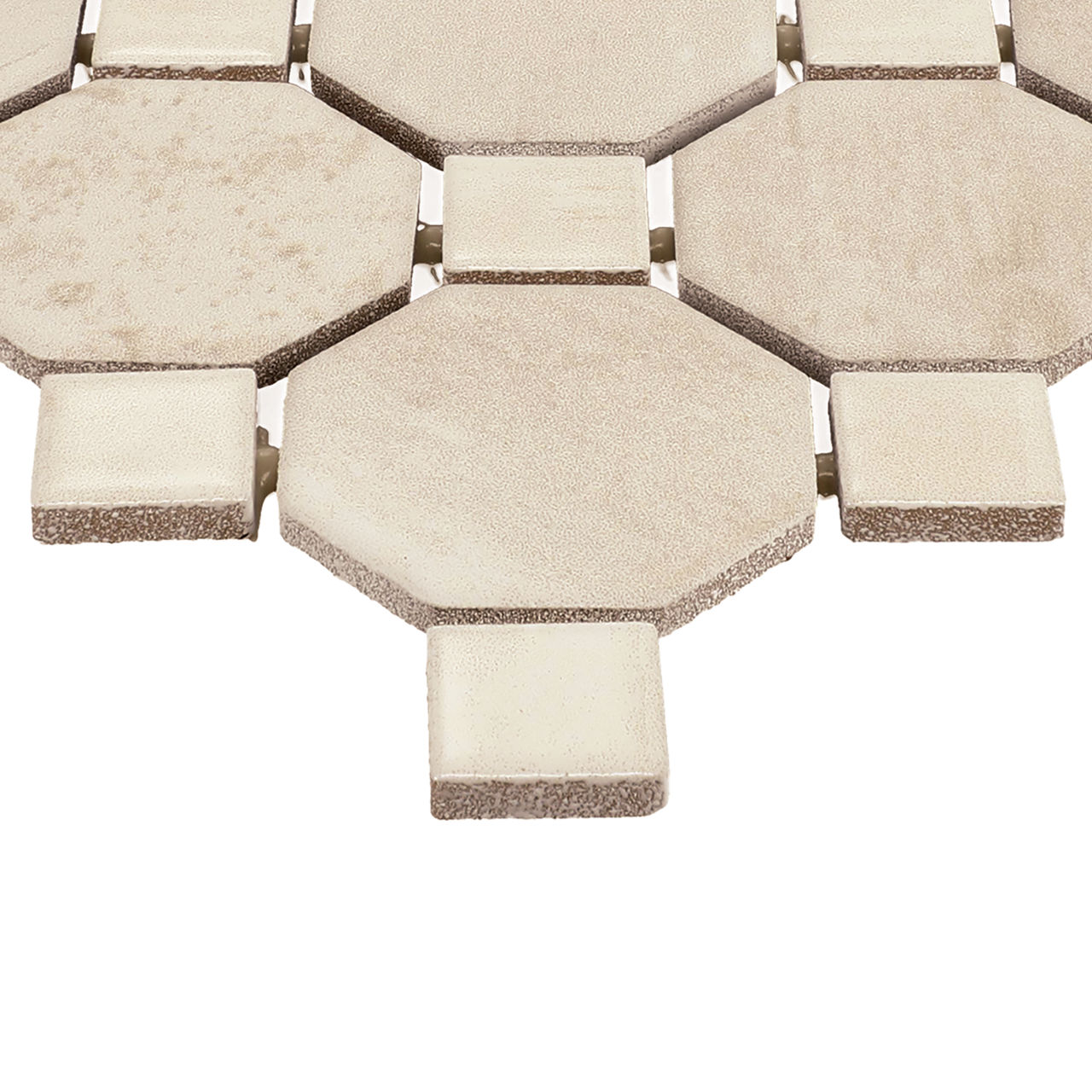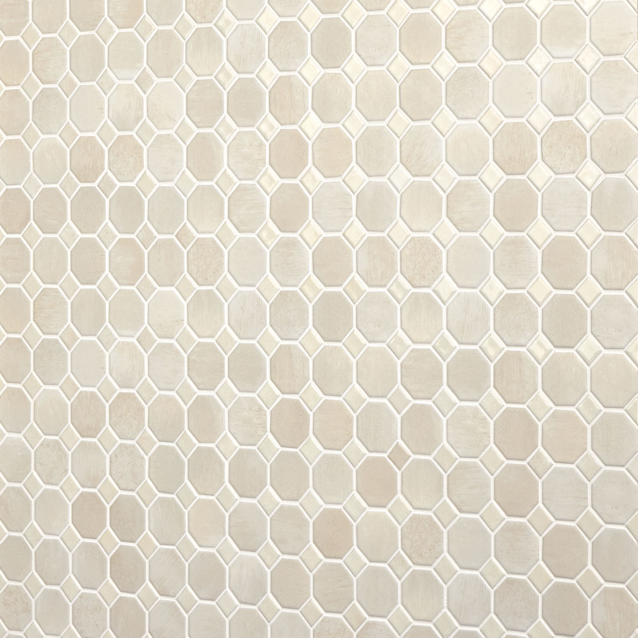 This beige porcelain mosaic tile showcases an octagon and dot design with timeless character for showers, floors, and backsplashes.