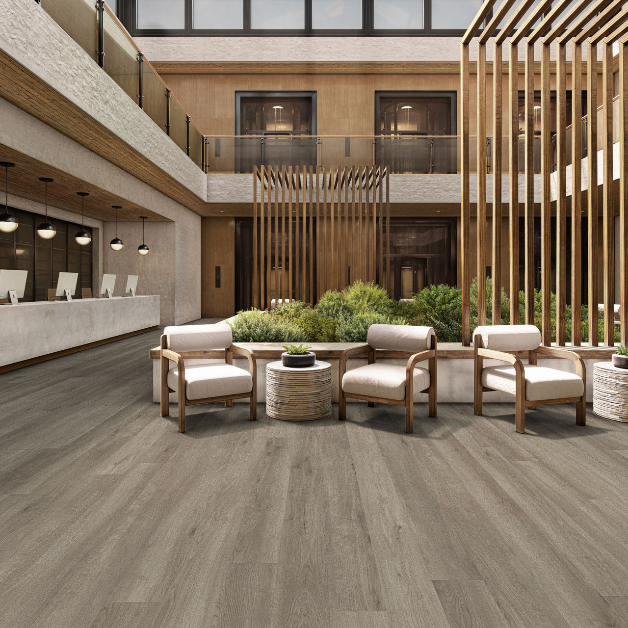 This wood-look luxury vinyl tile features natural grain detail with durable waterproof performance for modern commercial spaces. Each SKU features unique visual variation for added design authenticity.